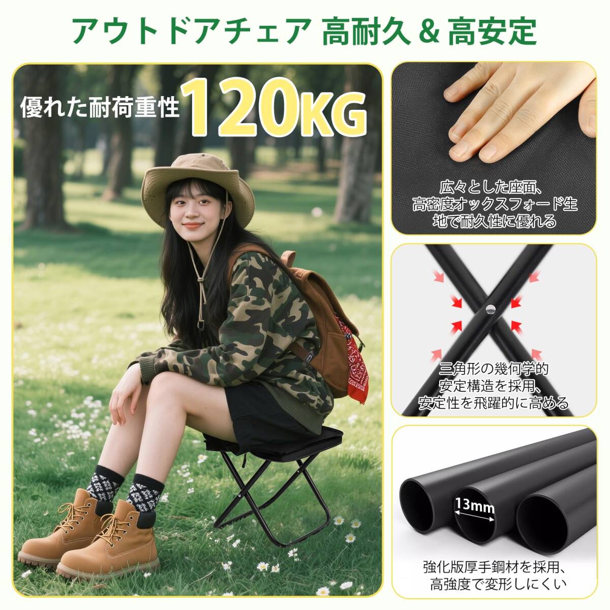 • 【高耐荷重・高耐久】携帯椅子は軽量ですが、耐荷重は 120kg に達します!座面は耐用生地を採用し、沈み込みにくいだけでなく耐久性も極めて高く、長期使用でも信頼できます