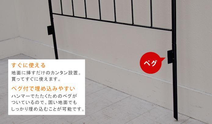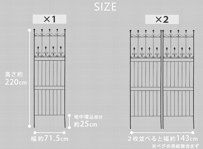 地中差込部分:約25cm。2枚並べた時の幅:約143cm(ペグ突起部含まず)