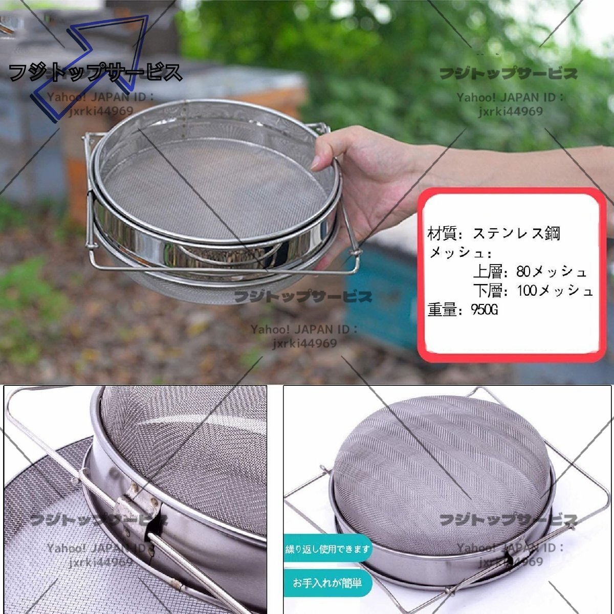 2重蜜 こし器 :2重構造,上層ステンレス ブラシ:直径23cm×高さ4.5cm、80メッシュ、下層ステンレス ブラシ:直径23.5×高さ8.5cm,100メッシュ、重量:950G。伸縮式ブラケットは40.5cmまで伸ばすことができます。