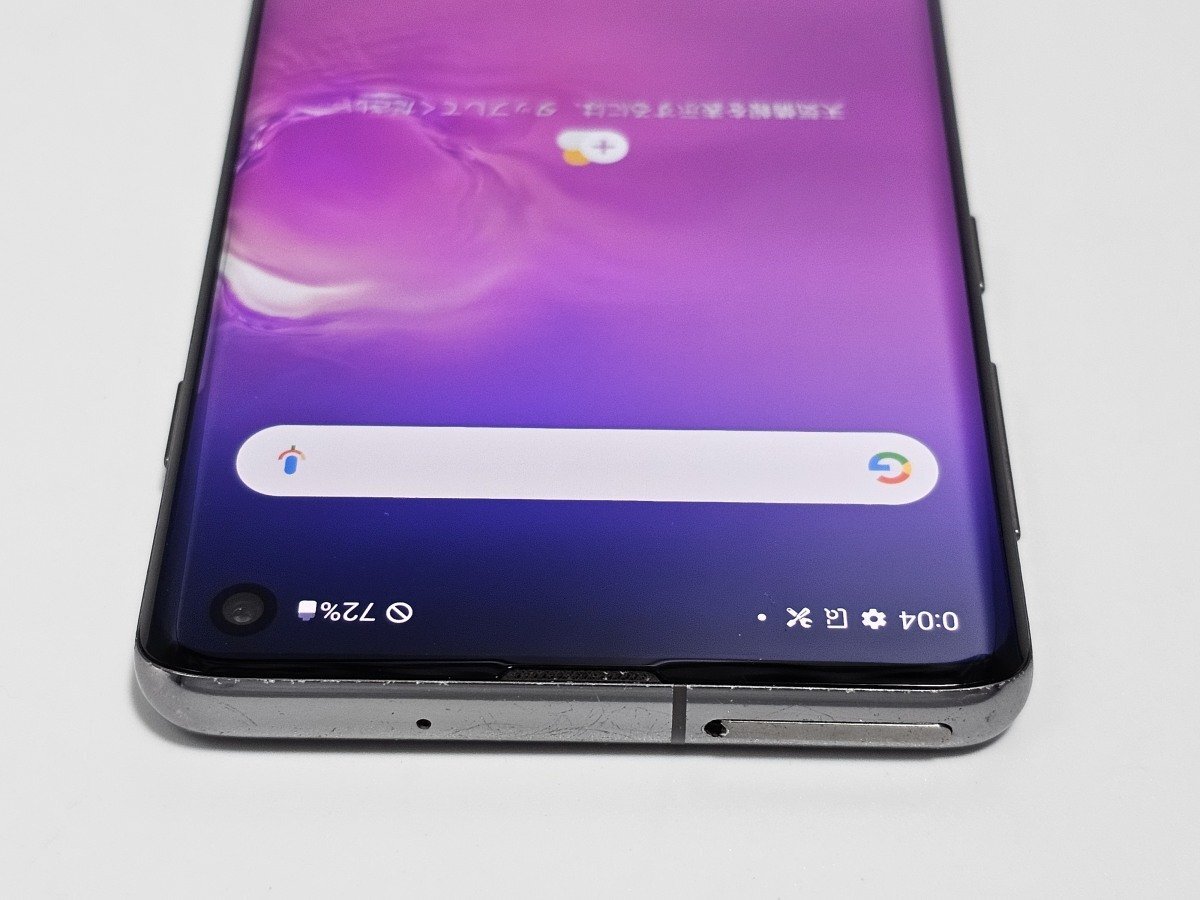 【外装状態】: C 液晶面に目立った傷はありません。側面は打痕や傷があります。SIMトレーの穴が割れています。背面は傷や擦れがあります。液晶にヤケがあります。背景が白いと分かります。背面パネルが浮いています。この機種特有の粘着の劣化と思われます。