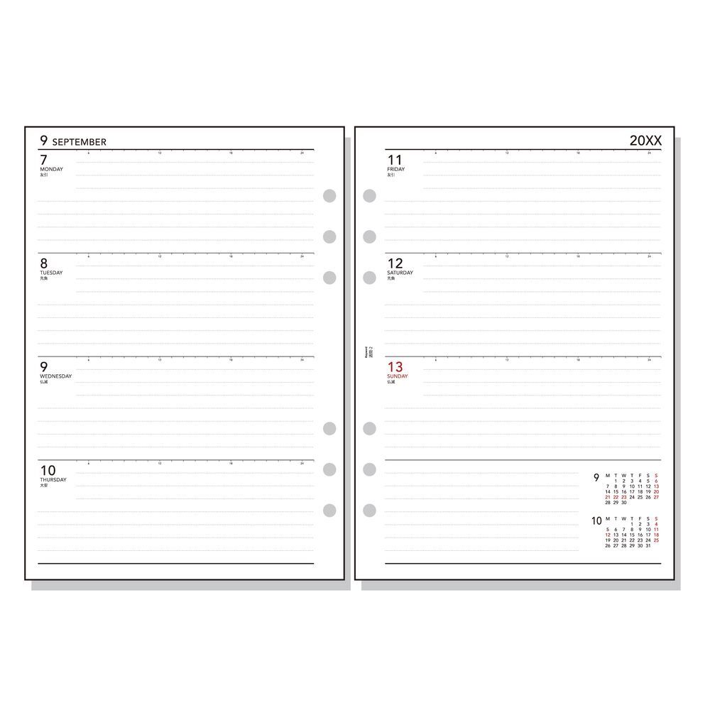 見開き両面1週間時間目盛付。