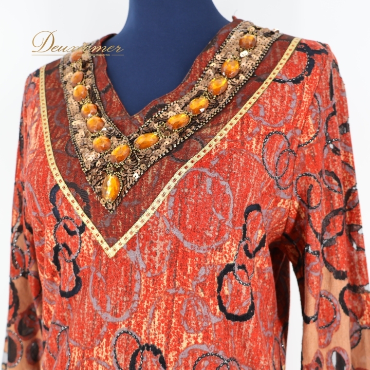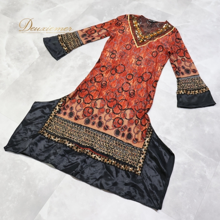 | 【商品名】ベリーダンス衣装 ガラベーヤ 【サイズ】L表記 平置き実測:総丈約124cm(裾~肩部まで)、肩幅37cm、身幅約48cm、ウエスト約42cm ※実測の為、多少の誤差はご了承ください 【仕様】 ・伸縮性無し 【品質表示】 表示無し ------------------------------------ 【ポイント】 ▽SEN ZI HUA ▽赤を基調とした華やかな色合い ▽豪華な装飾 ------------------------------------ 【撮影時使用トルソー】 種 類:女性用トルソー9号 (一般的に使用されるサイズです) サイズ:肩幅約37cm、バスト約88cm、ウエスト約66cm、ヒップ約89cm |