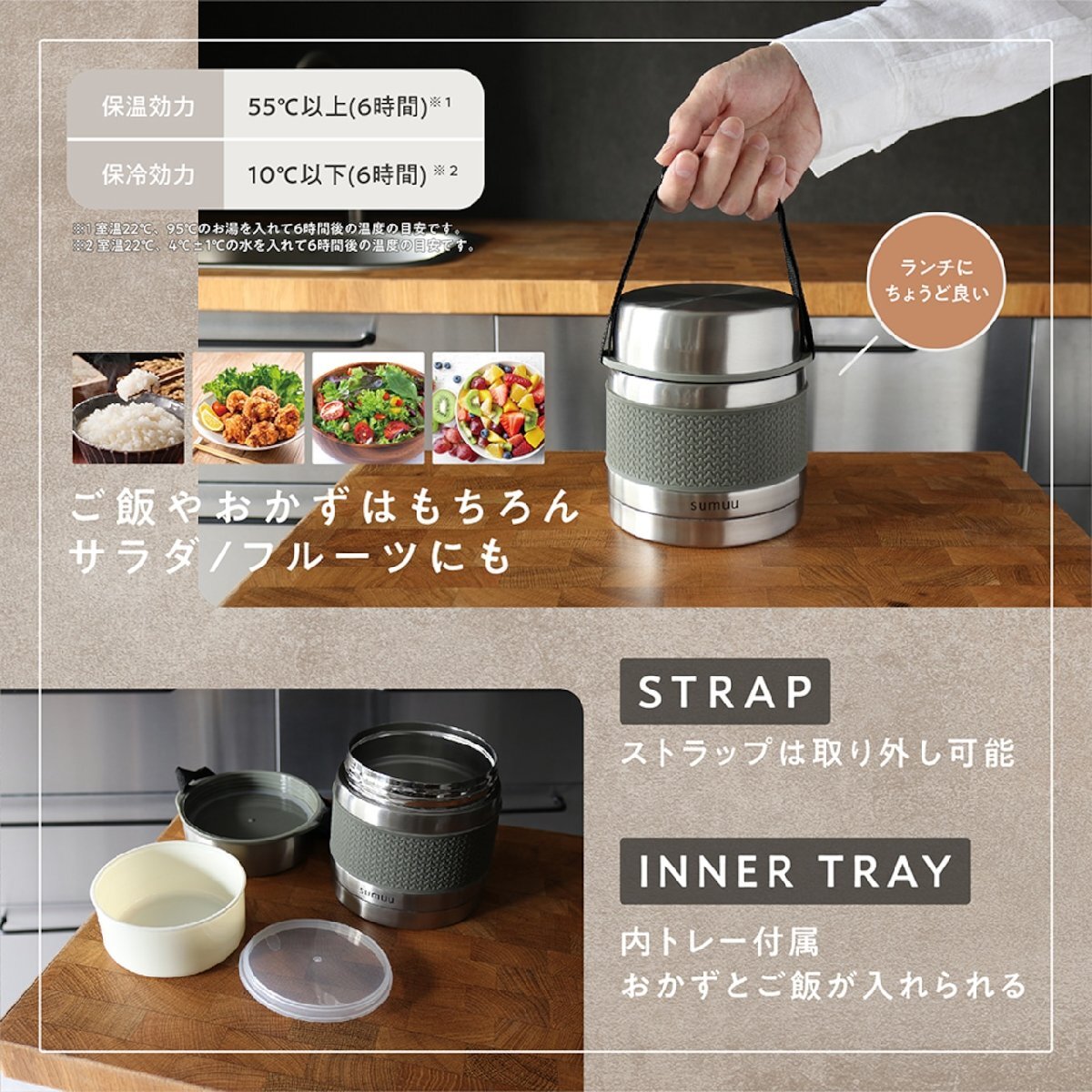 いつでもわたしと一緒のボトル スムウ ミーボシリーズ 真空断熱のダブルステンレスで、保温保冷に優れたボトルシリーズです。 ◆ご飯もおかずもしっかり保温できるフードジャー、サラダやフルーツにも ◆大容量850ml!内トレー付属 ◆ストラップ付きで持ち運びが簡単(ストラップは取り外し可能) ◆シンプルでスタイリッシュなデザイン ※スープなどの液体やとろみのある液状の食べ物には対応していません。 ※果物を入れる場合は内トレーをご使用ください。 (本体に直接果物を入れると、果汁によってステンレスが腐食する場合があります。) |