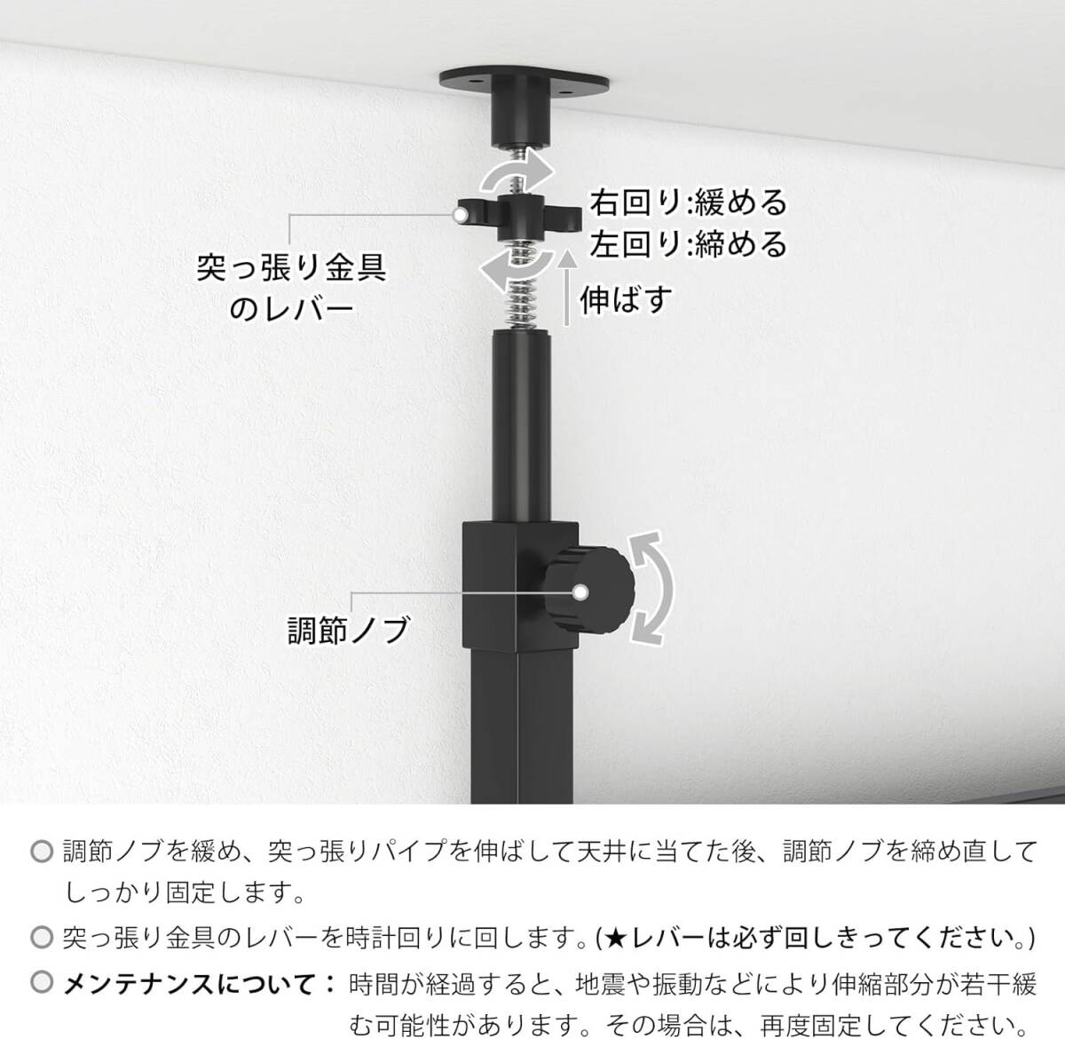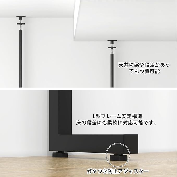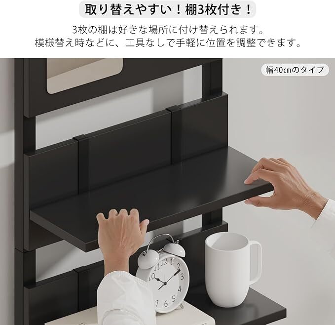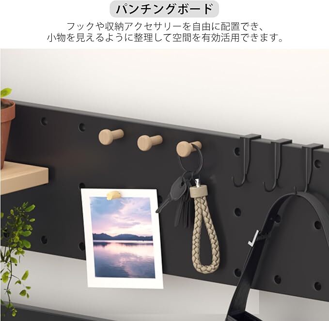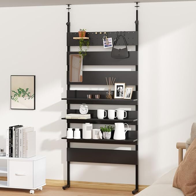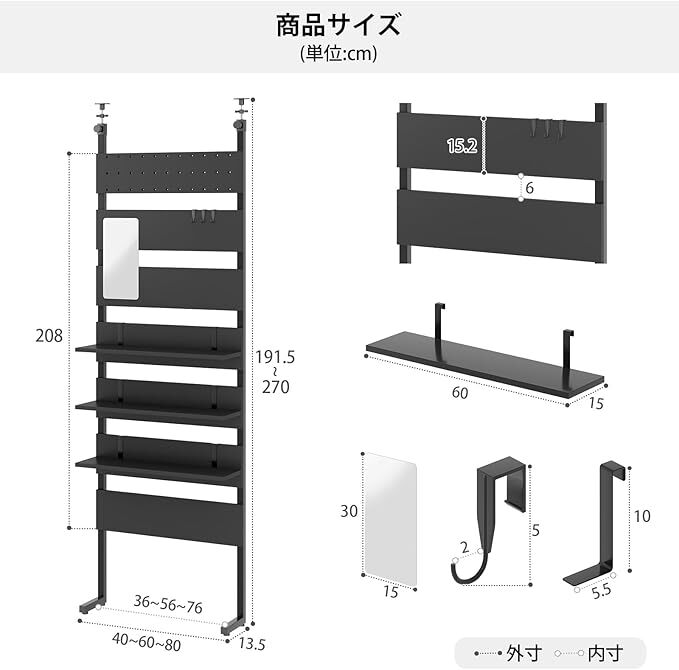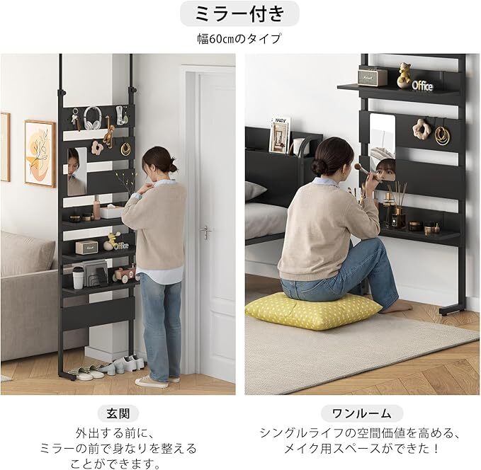 Amazon | 【ミラー・フック・パンチングボード付き】LunarLight つっぱり棚 突っ張り棒 有孔パネル付き 幅80×奥行き18.5×高さ191.5~270㎝ 突っ張り 壁面ラック 壁面収納 ウォールラック 可動棚3個 フック3個 段差対応 パーテーション 水に強い 組立簡単 (ブラック, 幅80㎝)