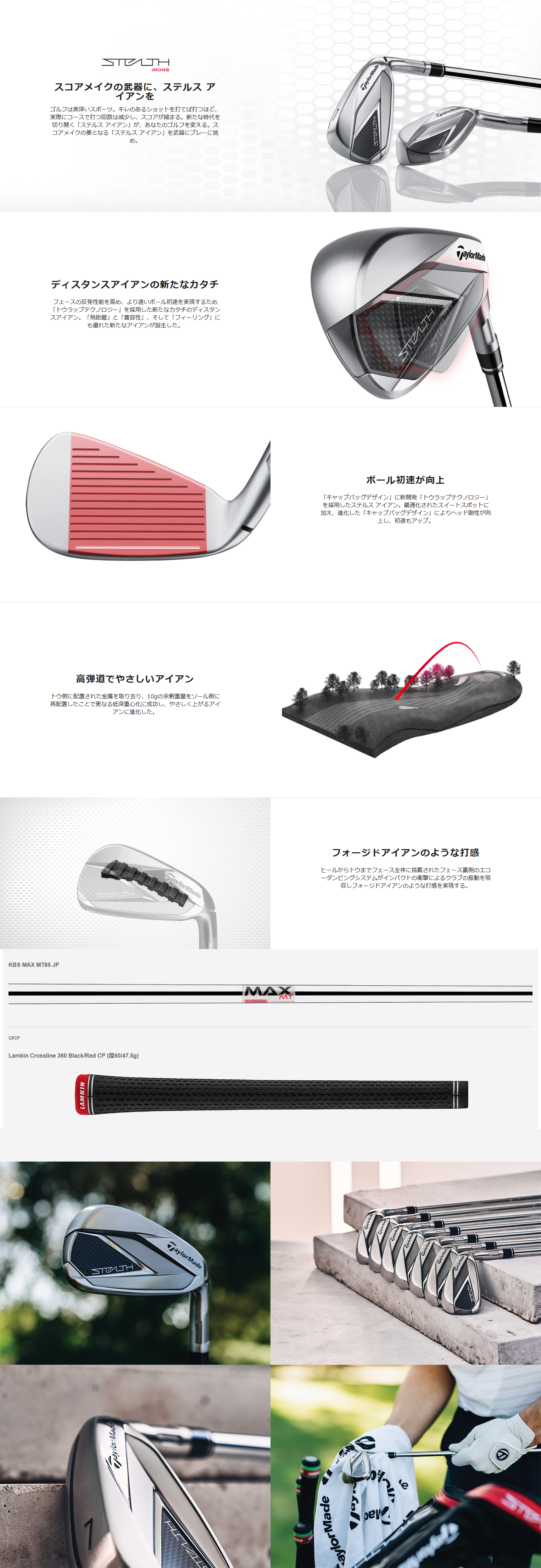 | テーラーメイド ステルス アイアン/KBS MAX85 JP スチールシャフト 新品・未使用、右利き フレックスS #6,#7,#8,#9,PW,AW,SWの7本セットです。 ●「キャップバックデザイン」&「トウラップテクノロジー」 トウ側に配置されていた約10gの金属を取り去り、生まれた余剰重量を最適配分する「トウラップテクノロジー」の採用により、さらなる低重心設計を実現。 より低重心化したヘッド構造により、優れた「飛距離」、「寛容性」、「フィーリング」を兼ね備えたアイアンが生まれた。 ●プログレッシブICTを採用したハイスピードフェース 番手別にスイートエリアをコントロールするICT(インバーテッドコーンテクノロジー)を搭載。 適正なボールスピードと高い寛容性を兼ね備えながら、各番手に求められる飛距離性能を忠実に発揮する。 ●エコーダンピングシステム フェースの裏側に配置されたエコーダンピングシステムは、 フェース内に複数の衝撃吸収部分を設けることで フェースの反発力を損なうことなくインパクト時の衝撃と振動を低減し、 フォージドアイアンのような打音と打感を実現する。 ●貫通型スピードポケット テーラーメイド独自の貫通型スピードポケットにより、フェース下部で打ってしまったミスヒットでも無駄なスピンを抑えてボール初速維持に貢献する。