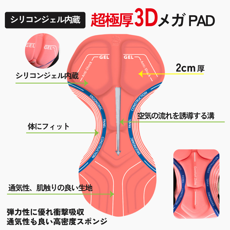 [極厚パッド]3Dメガパッド付きの防寒用インナーパンツ 冬のインナーサイクルパンツにパッドが付いた新しいパンツです。 ロードバイクやクロスバイク、マウンテンバイクなどのツーリングやサイクリング時におすすめ。 冬用のインナーパンツは少ないのでサイクルパンツに抵抗がある方にも 冬でもサイクリングを楽しんでいただけます。 下着代わりになるのでバイクのツーリングや長時間の座り仕事や作業時など普段使いにもおすすめ。 パッドは超極厚シリーズの3Dメガパッド。クッション性に優れお尻の痛みを軽減します。 [カジュアルに履ける] サイクルパンツに抵抗のある方でも履ける! 冬の厳しい寒さもインナーに着用する事で防寒対策にもなります。 普段着のズボンの下や短パンと合わせたり。 下着代わりに履けるので自転車だけでなく長時間のバイクツーリングや 座り仕事などのシーンでも活躍できます。 [保温性] 内側は保温性を高める裏起毛素材で肌ざわりが良く 柔らかく気持ちが良い。 また肌がチクチクしない縫合技術。 [伸縮性・弾力性] スパンデックスを使用しているので伸縮性(ストレッチ性)がとても優れているので着用していても 身体にフィットするので激しい運動でも動きにあわせて伸縮します。 [通気性速乾性] 通風性、呼吸性のある表面生地、汗を早く発散でき、汗を掻いても素早く吸収し発散させます。 汗冷えを軽減。 [防風] 冷たい風をしっかりブロック。 風を受けて体が冷えるのを軽減します。 [超極厚パッド] 人体工学に基づき、お尻、会陰部に衝撃吸収の分厚い約2cmシリコンジェル内蔵パッドを配置 真ん中には空気の流れを誘導する溝デザイン 両側の溝は人体構造に合わせたフィット感でペダリングの邪魔にならない。 [お尻の痛みを軽減] サドルの上に長時間座り走り続けるとお尻や股間が圧迫されて痛みがでて辛い。 楽しいはずのサイクリングも残念な気持ちに。 超極厚3Dメガパッドでこれらの症状を起こりにくくします。 [ハイウエスト] 長めのウェスト弾力バンド。 サイクリング時にも締め付けすぎず快適に。 素材パンツ:90% polyester, 10% spandex パッド:シリコンジェル、スポンジ(密度28g/cm3) カラーブラック MEGAパッド厚みMAX 2cm、MIN 0.25cm 長さ37cm, 幅12-21cm ※秋、冬向き、サイクリング時使用、保温性のあるインナーパンツです。 《ご注意》 ・商品は入荷によりキズがある場合があります。 その場合、保証対象外になりますのでご了承お願い致します。 ・ディスプレイ環境により実物と色が異なる場合が有ります。 ・入荷時期により予告無く一部仕様変更する場合が有ります。 | |