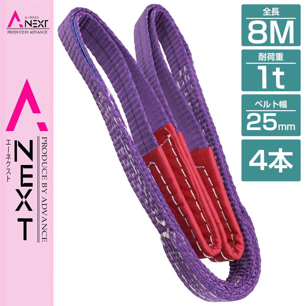[4本 セット/耐荷1t/長さ 8m] スリング ベルト 吊上げ ナイロン クレーン ロープ 荷吊り 玉掛け 牽引 運搬 1000kg 1トン 幅25mm