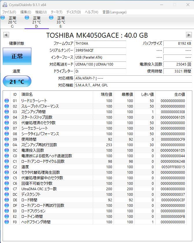 中古動作品★2.5インチ 内蔵HDD 東芝 2.5inch HDD 40GB MK4050GACE