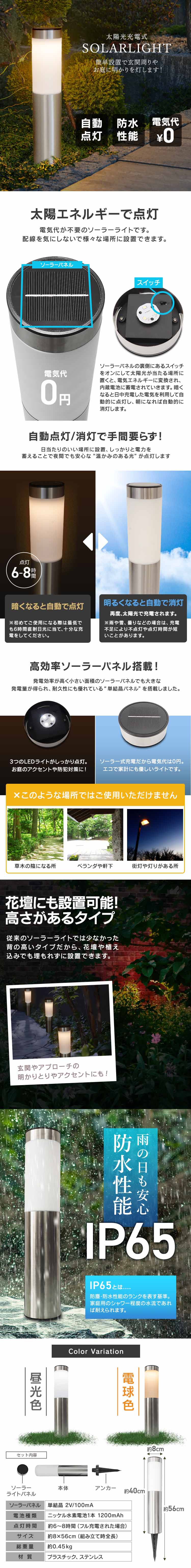 お庭や玄関先などに最適なLEDソーラーライトです。 地面に差すだけとセッティングもカンタン。 暗くなったら自動点灯、明るくなったら自動消灯。 ソーラーパネルが日中太陽の光で充電し、夕暮れになると自動的に点灯します。 お手軽カンタンに、自宅のお庭を彩ります。 付属品のアンカーを地中に埋め込んで固定し、玄関までの通路や 庭先までのアプローチ部分にやさしい明かりを灯して下さい。 ガーデニング照明にも最適! 【商品詳細】 内容 ・本体 ×4 ・ソーラーパネルライト ×4 ・アンカー ×4 【商品詳細】 カラー:ホワイト×シルバー サイズ ・直径:(約)8cm ・ソーラーライト本体:(約)40cm ・全高:(約)56cm 重量:(約)450g 発光色:電球色 光源:LED 電池:ニッケル水素電池1本 1200mAh 点灯時間:(約)6~8時間 ※直射日光が6時間以上あたる場所に設置した場合 素材:プラスチック、ステンレス 【もちろん新品未使用品です】 商品コード:ACA00100 |