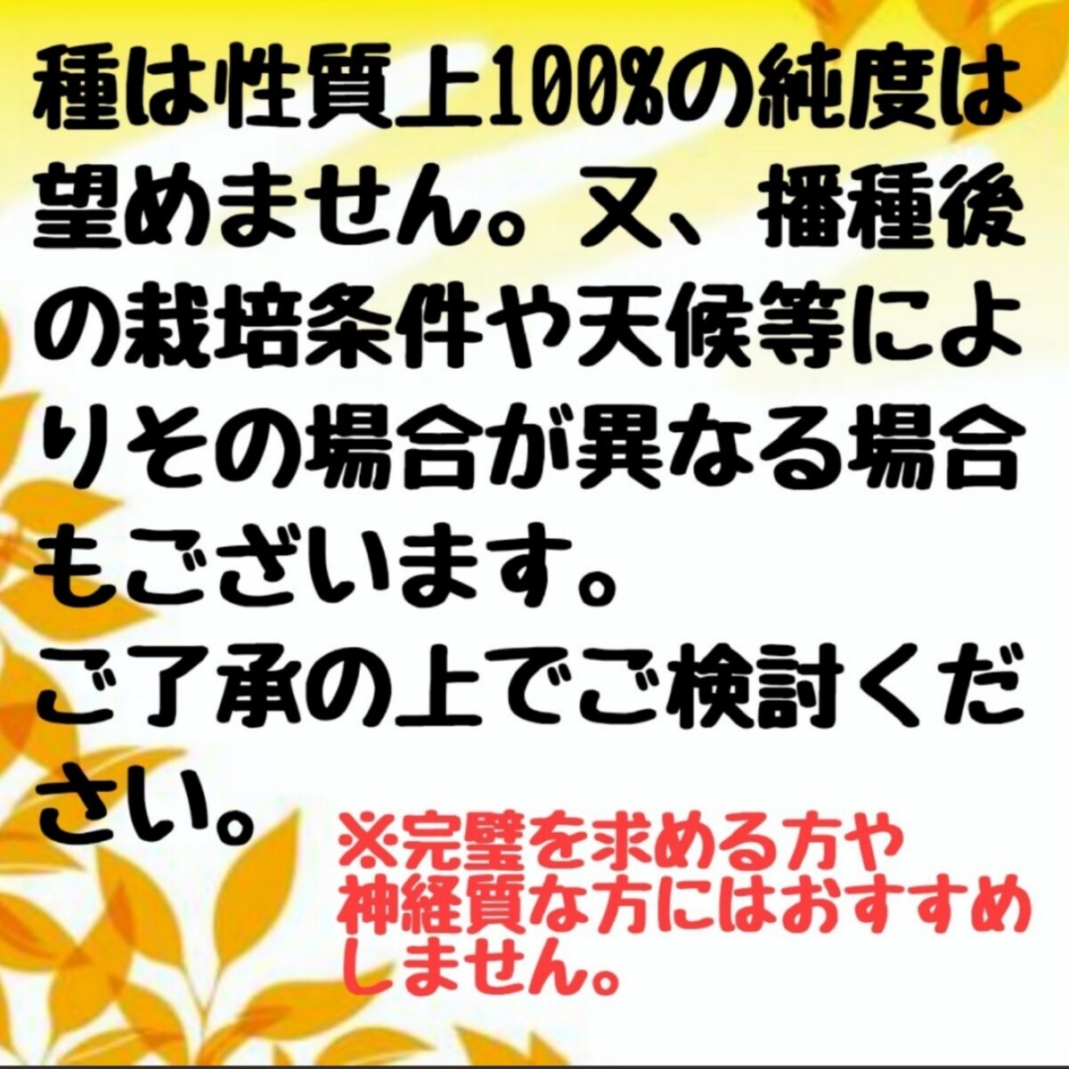 種は性質上100%の純度は望めません。また播種後の栽培条件、環境等によりその結果が異なる場合もございます。ご了承の上でお求めください。