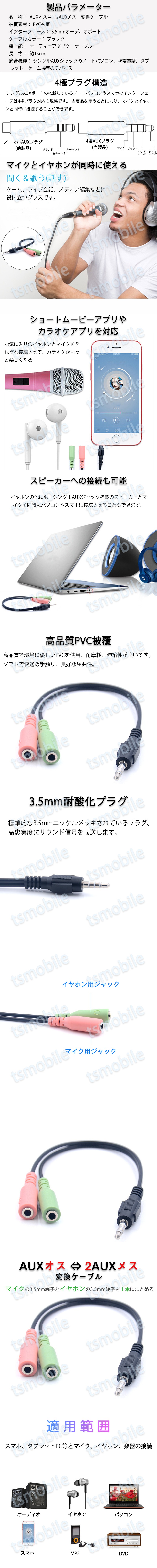 | 製品パラメーター名称:AUXオス⇔ 2×AUXメス 変換ケーブル被覆素材:PVC被覆インターフェース:3.5mmオーディオポートケーブルカラー:ブラック機能:オーディオアダプターケーブル長さ:約15cm適合機種:シングルAUXジャックのノートパソコン、携帯電話、タブレット、ゲーム機等のデバイス,AUX3.5mm出力プラグ搭載の楽器やマイク、AUX3.5mm入力プラグ搭載のイヤホンやスピーカー4極プラグ構造シングルAUXポートの搭載しているノートパソコンやスマホのインターフェースは4極プラグ対応の規格です。 当商品を使うことにより、マイクとイヤホンと同時に接続することができます。お気に入りのマイクとイヤホンが同時に使える。ゲーム、ライブ会話などに役に立つグッズです。ショートムービーアプリやカラオケアプリを対応。標準的な3.5mmニッケルメッキされているプラグ、高忠実度にサウンド信号を転送します。 |