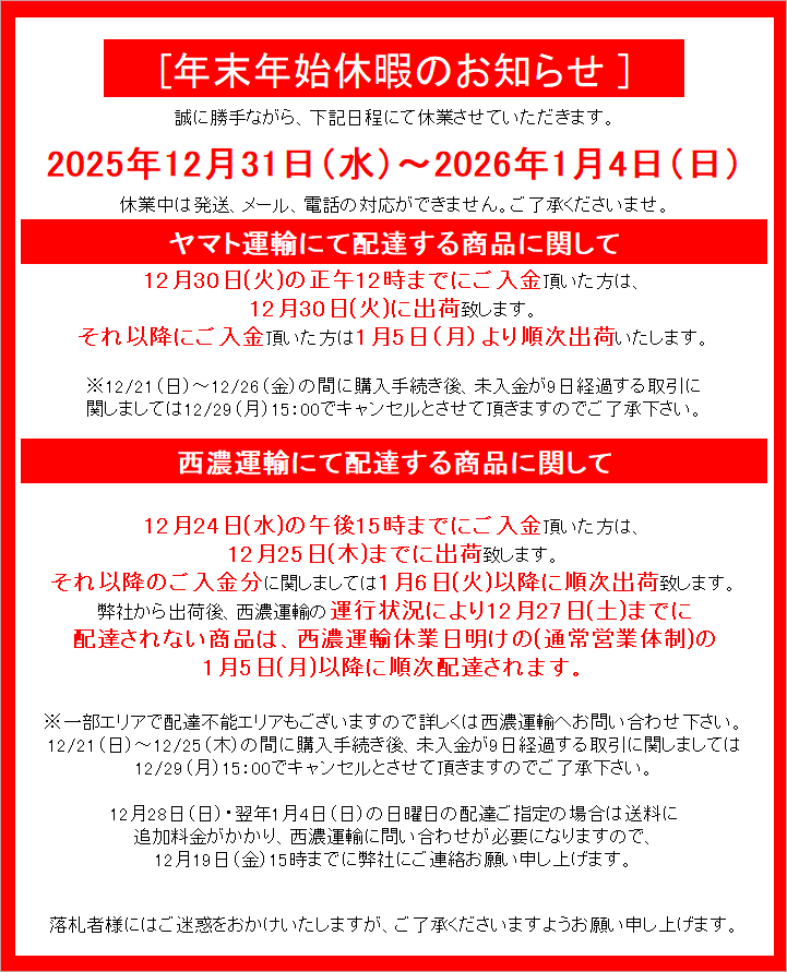 | ■ヤマト運輸 [北海道] 2510円 (北海道) [北東北] 1920円 (青森、岩手、秋田) [南東北] 1790円 (山形、宮城、福島) [ 関東 ] 1650円 (茨城、栃木、群馬、埼玉、千葉、東京、神奈川、山梨) [ 信越 ] 1650円 (新潟、長野) [ 中部 ] 1530円 (静岡、愛知、岐阜、三重) [ 北陸 ] 1530円 (富山、石川、福井) [ 関西 ] 1530円 (滋賀、京都、大阪、兵庫、奈良、和歌山) [ 中国 ] 1530円 (鳥取、岡山、島根、広島、山口) [ 四国 ] 1530円 (香川、徳島、愛媛、高知) [ 九州 ] 1650円 (福岡、佐賀、長崎、熊本、大分、宮崎、鹿児島) [ 沖縄 ] 2710円 (沖縄) ヤマト運輸の元払いのみでお願いいたします。 送料はお届け先の都道府県をご確認ください。 こちらの商品は上記配送方法以外でのお取引はしておりません。 予めご了承ください。 当方はオークションストアの為、落札価格に、消費税を頂戴いたします。 お振込み金額は【 落札金額+消費税+送料 】 です。 オーダーフォームからお客様の情報を送信していただいた後、ご入金の確認が出来次第の発送となります。 業務の都合上、多少遅くなる事がございますが、ご入金から遅くとも3営業日以内には発送できるように努力いたします。 営業時間は平日(月)~(金)の午前9:00~午後17:00です。 営業時間外、土、日、祝日は、オークションに関する一切の連絡、出荷などの対応は出来ません。 上記の内容のご理解をお願いいたします。 商品の発送後にはオーダーフォームにご入力いただいたメールアドレスのほうに、 荷物の問い合わせ番号を記載してご連絡いたします。 特定商取引法等に基づく表記 ↑必ずご確認いただきますようお願いします。 |