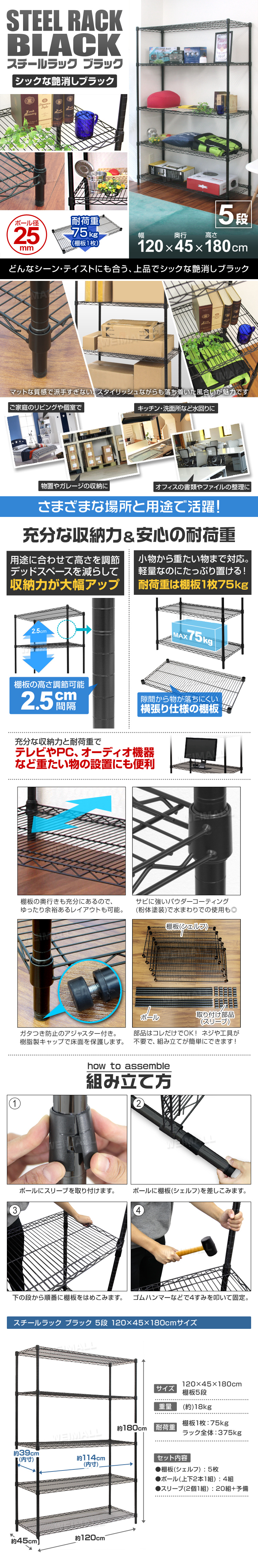 | どんなお部屋にも合わせやすいスチールラックです。 ぐらつき防止アジャスター付き! クギやネジを使わずに簡単に組み立て出来ます! 棚の高さを自由に変えることができます。 一人暮らしのお部屋やリビング、キッチン、物置など場所を問わず活躍できます。 錆に強いパウダーコーティングで水回りでの使用も◎ アパレルショップの店頭用やオフィスにも使用されています。 【仕様】 サイズ(約):幅120×奥行45×高さ180cm 耐荷重(約):(全体)375kg / (棚板1枚あたり)75kg 材質:スチール(クロームメッキ)、ABS樹脂他 重量(約):18kg カラー:ブラック 【商品内容】 シェルフ(棚板) ×5 ポール(上下2本1組) ×4 スリーブ(2個1組) ×20(+予備付属)} 【もちろん新品未使用品です】 |