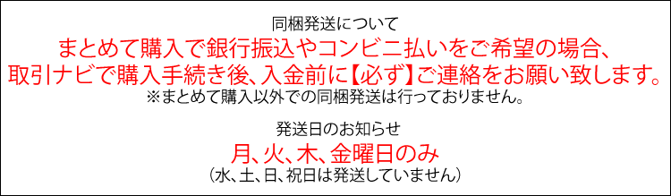 大きさ、地域により送料は異なります。 詳しくは下記配送方法欄の料金表ページを ご参考ください。 <他社業者、メール便、定形外、着払い、同梱発送不可> |