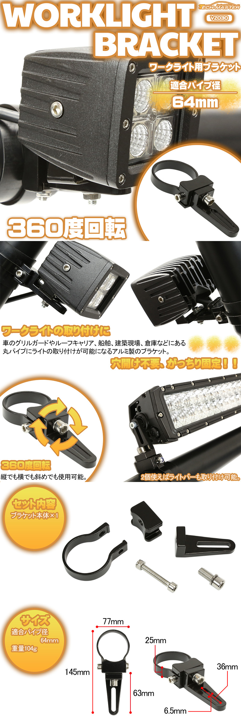 | 車のグリルガード、ルーフキャリア、船舶、建築現場、倉庫などにある 丸パイプにライトの取り付けが可能になるブラケット。 穴開け不要でライトをがっちり固定します。 360度回転し、縦でも横でも斜めでもご使用可能です。 |