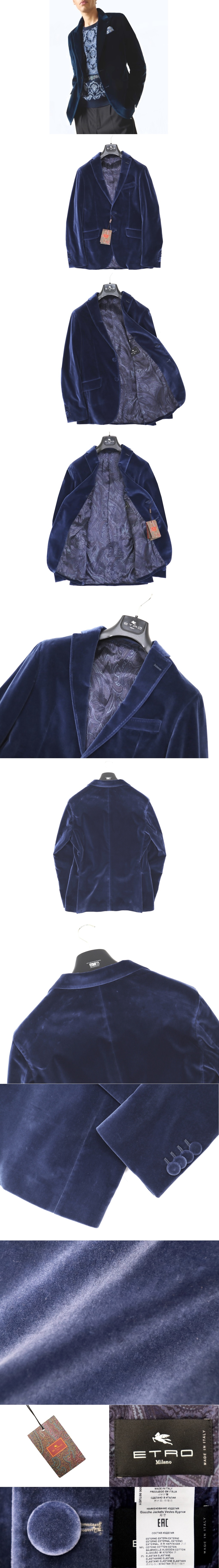 32万新品◆50=L◆【ETRO】エトロ◆ベロア素材×ペイズリー柄裏地 ジャケット 青ブルー