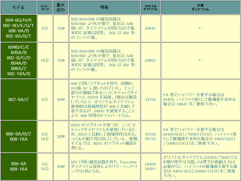 604, 605, 800番台, 900番台の全てに適合します。 ★下記の表のユニットのすべてにフィットいたします。(Altec 適合参考資料) 当社オリジナルの「アルミ振動板」採用ダイアフラムとなります。 多くの社外ダイアフラムはガイドピン穴がきつく加工を要する場合がありますが、こちらは無加工でそのままご使用いただける製品となっております。是非お試しください。 出品価格は 《2枚》(ペアー)の価格です。 ★ 同製品の 8Ω もございます。出品されていない場合はオークションが終了している事もございますので、その場合はお問合せ下さい。 |