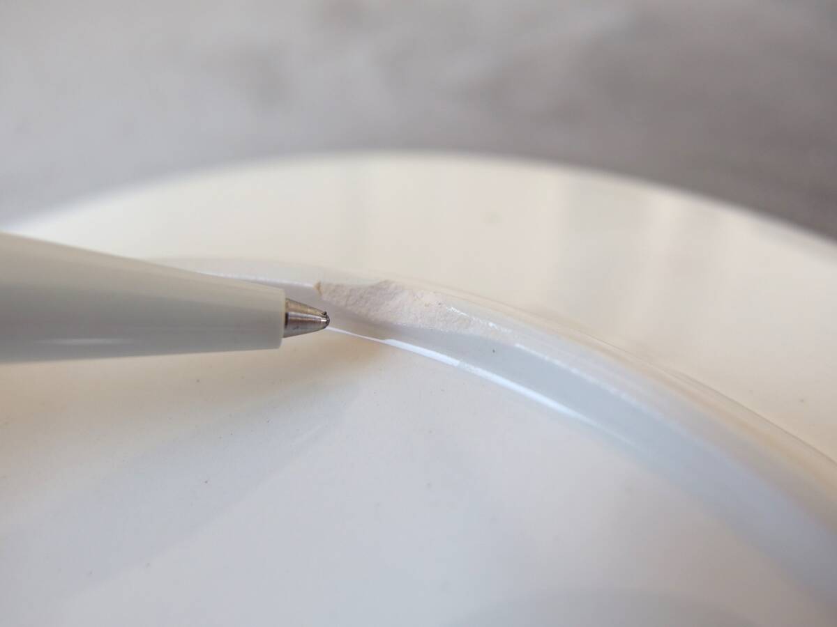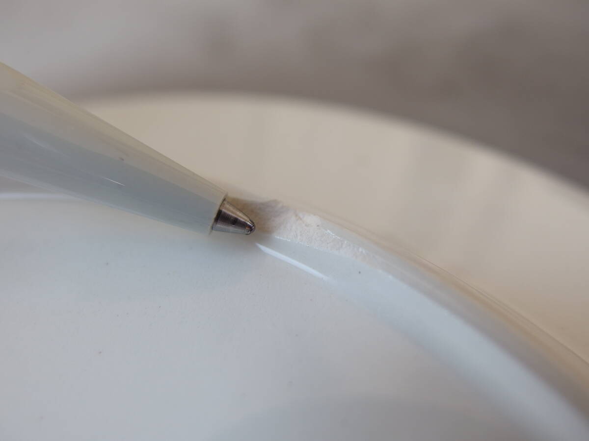 裏面に点状の痕が均等に3箇所ございます。これは釉薬を焼き上げる際、支柱において窯に入れた為にできた痕です。