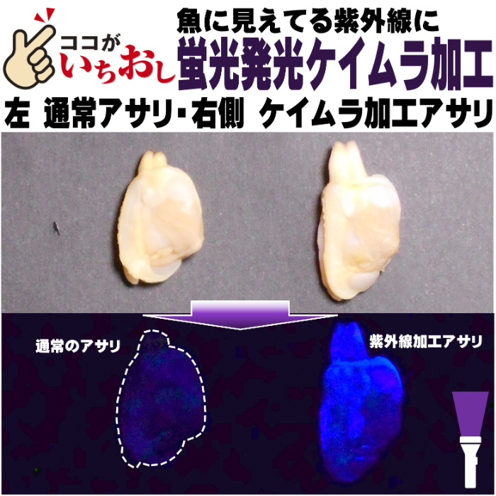 そんな魚に見えている紫外線にケイムラクリアホワイトに蛍光発光して強烈アピール。