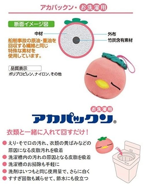 | ●アカパックンを洗濯機に入れて洗濯するだけで、洗濯中に上層部に浮かんできた皮脂汚れを吸着してくれる ●洗濯中に衣類から出る皮脂を吸着することにより、付け置き・部分洗いの手間も省けて、お洗濯がラクに ●室内干の嫌な臭いの発生や、脱水時に皮脂が再付着するのを防止 ●衣類に皮脂が再付着しないので、洗濯物の黄ばみや臭いを抑えることが出来る ●洗濯洗剤の使用も軽減し、環境にもやさしい |