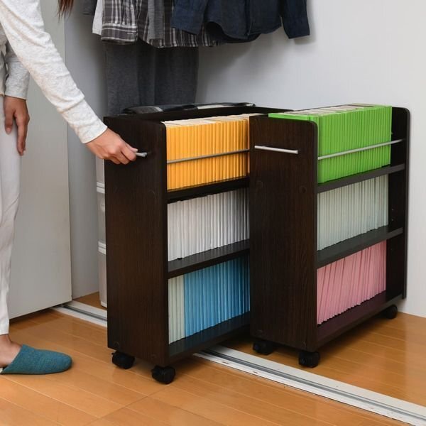 キャスター付きの便利なクローゼットラック2個組。 取っ手はどちらにも取り付け可能なので、収納箇所の向きは左右入れ替えできます。 本やメディア類や日用品のストックまで、 クローゼット内のスペースを有効活用するのでお部屋をすっきり片付けられます。 |