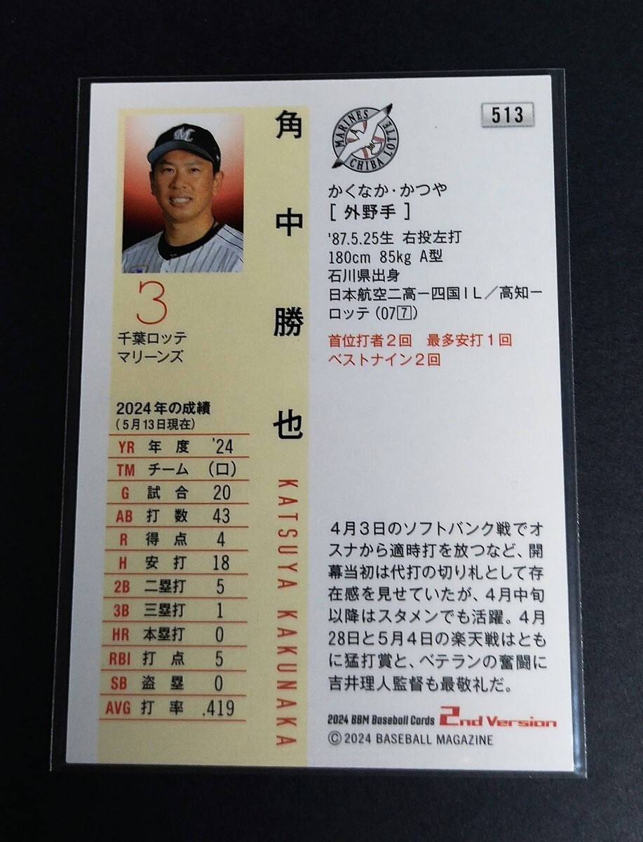 2024年BBM 2nd 角中勝也(ロッテ)銀箔サイン入り。No,513。