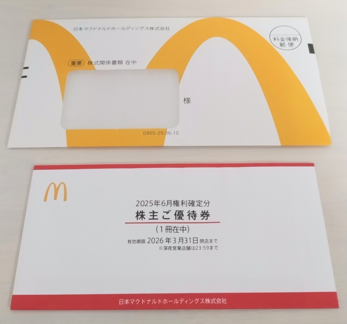 マクドナルド 株主優待券 1冊(6枚綴り)2026/3/31 期限 ★ フード ドリンク 券 バーガー ハンバーガー ナゲット ポテト マック 株主 優待