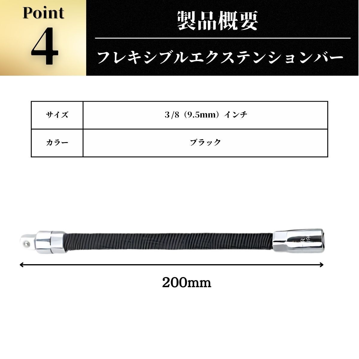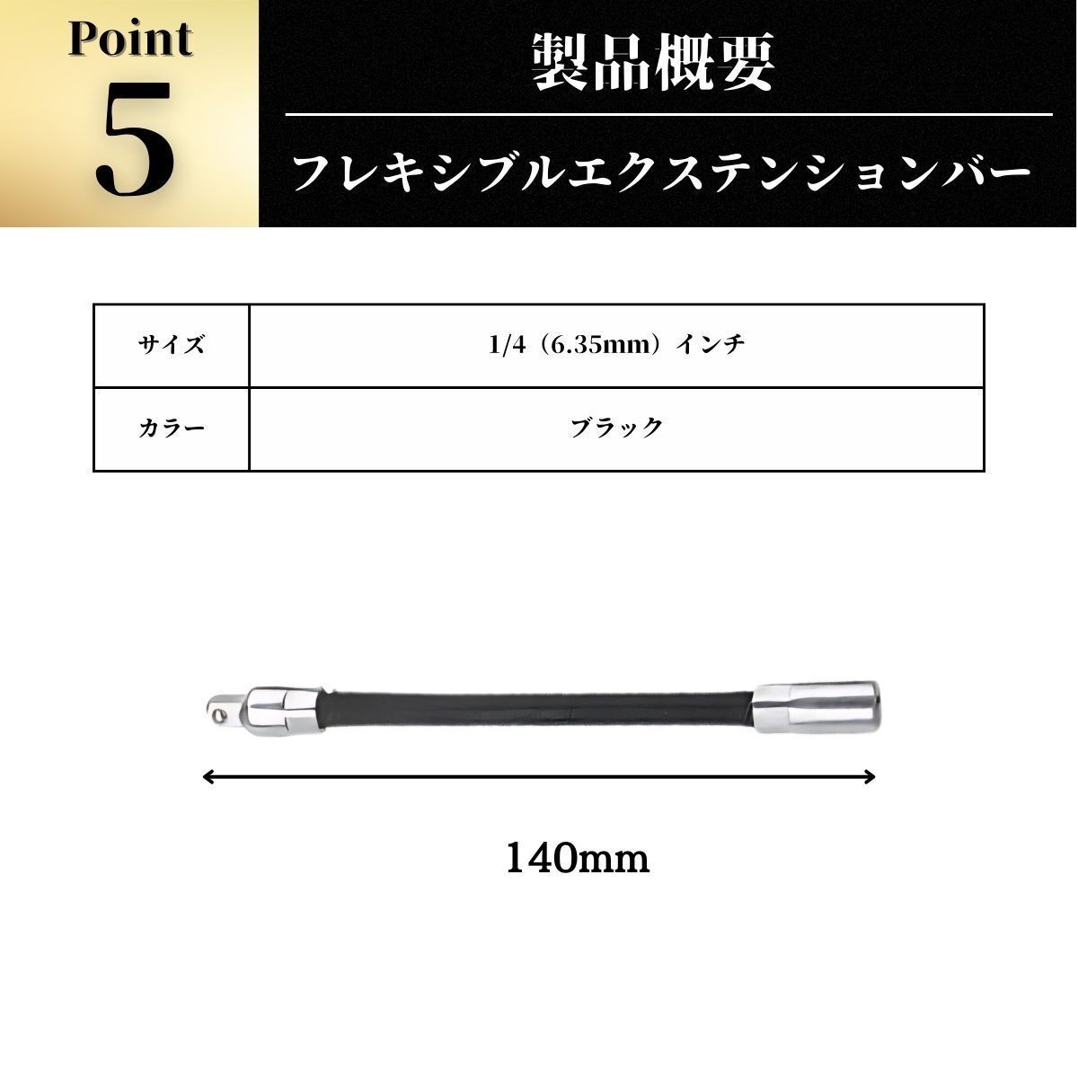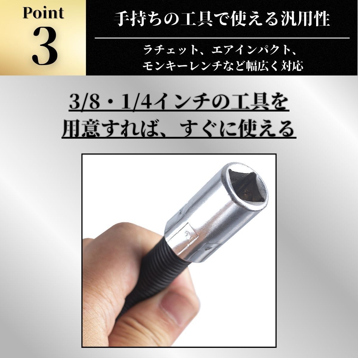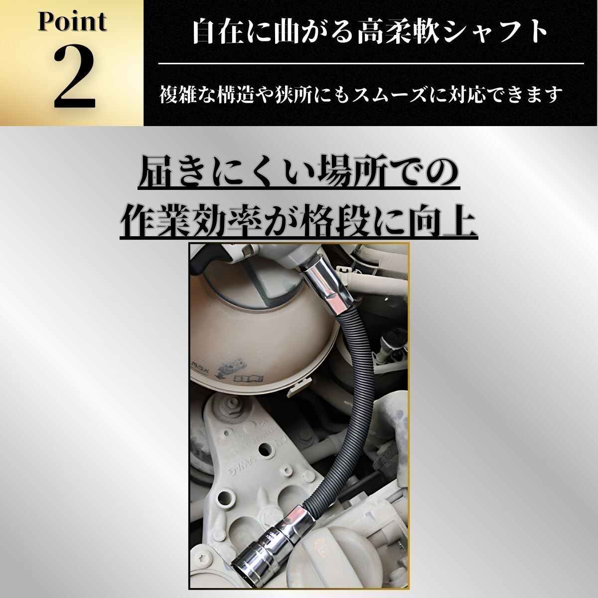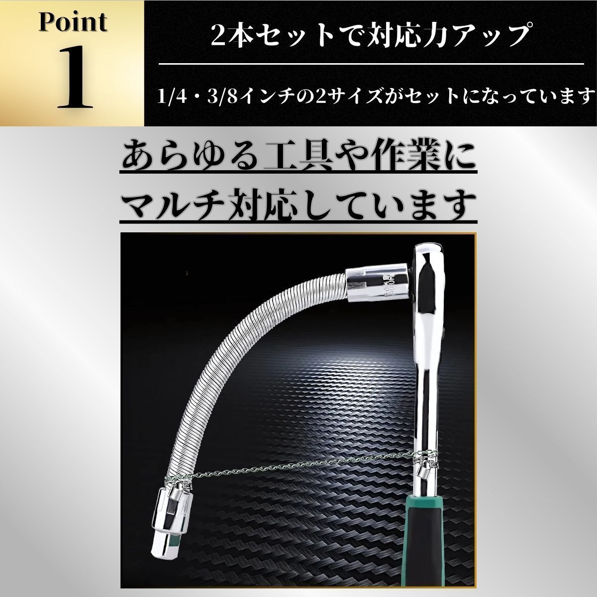 2種類のサイズ(1/4インチ・3/8インチ)がセットになっており、さまざまな電動ドリルやレンチに対応可能。柔軟なシャフトは自由な角度に曲げることができ、複雑な構造の機械や自動車エンジン周辺でもスムーズな作業が行えます。