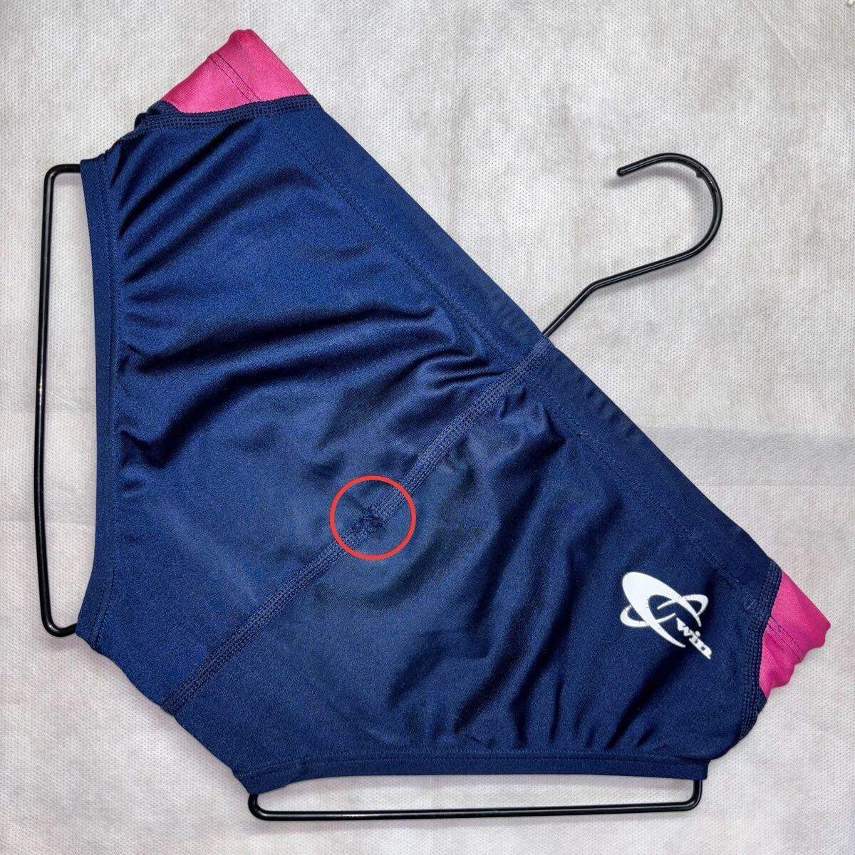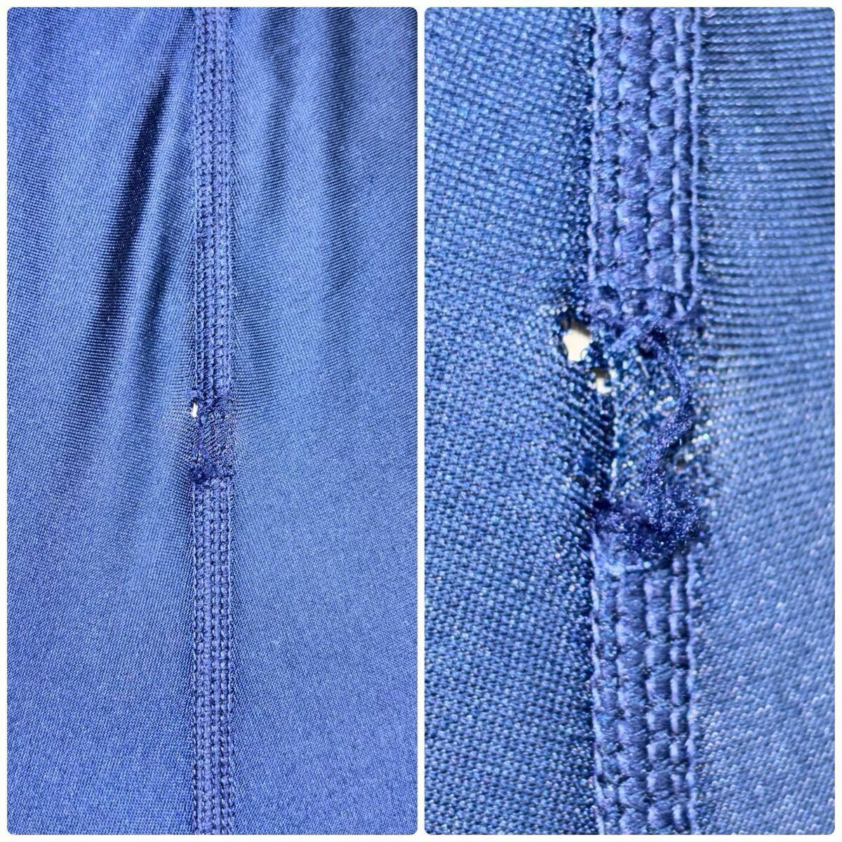 ロゴのダメージ、お尻にスレ毛羽立ちテカリと中央縫合ラインにほつれ、それに伴うに穴あき箇所がございます。全体を通して使用感のあるお品になります。