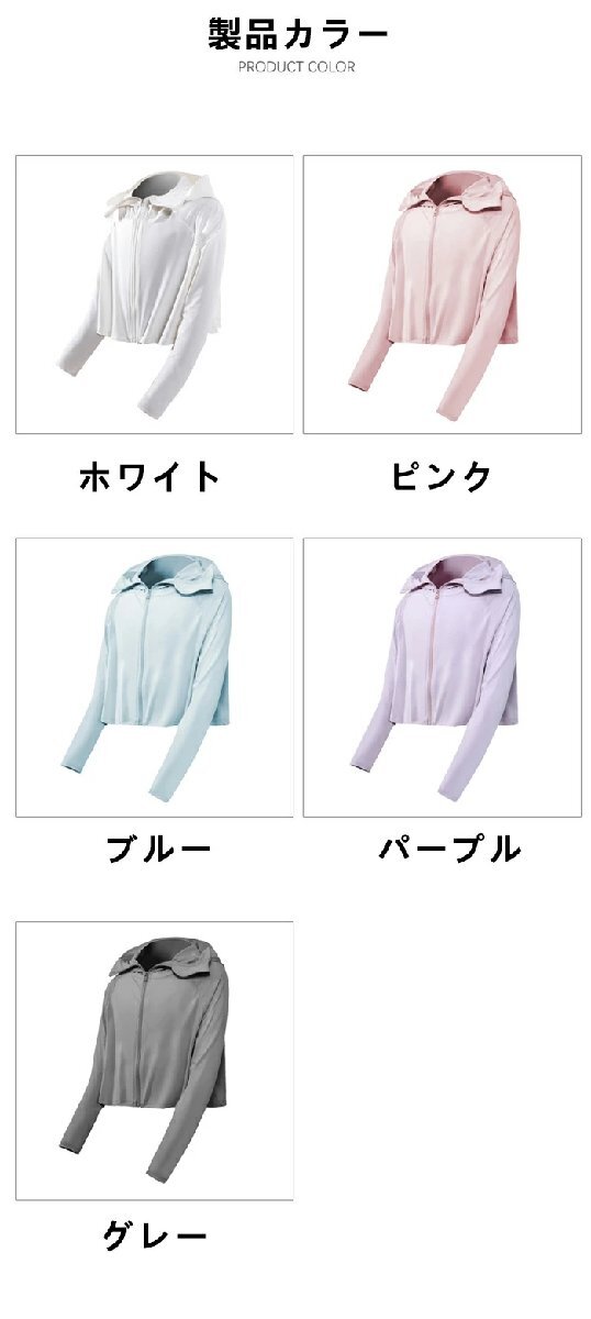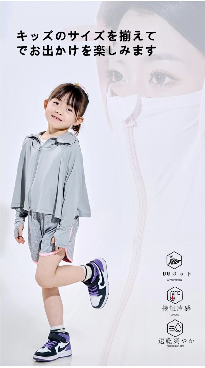 パーカー付きで、髪が長い場合後ろから出すことができるのでスッキリできます。ハイネックで首の日焼けも防ぎ、生地はなめらかで伸縮性の良いスムース素材。