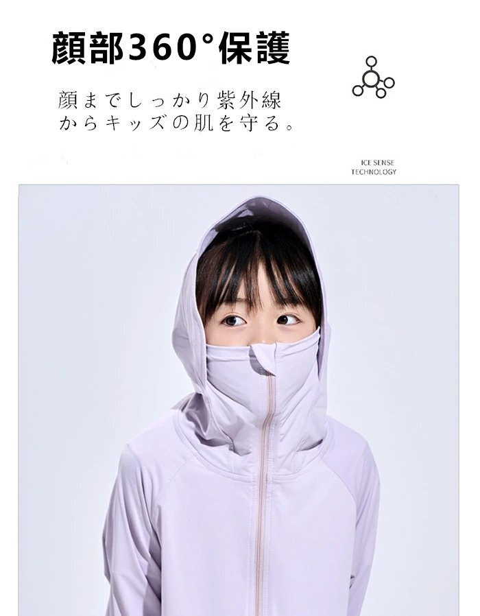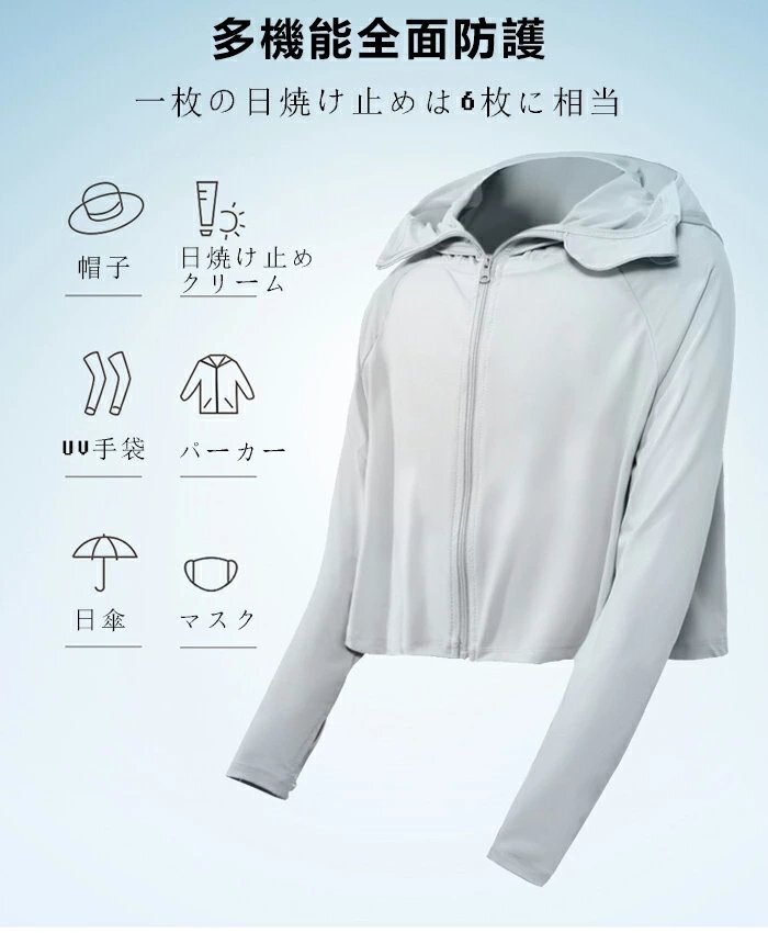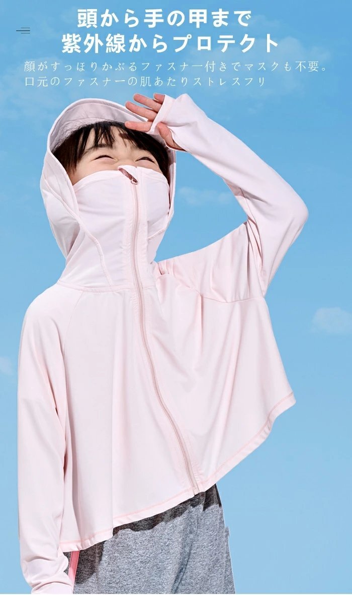 ジッパーを一番上に閉めるとタートルネックになり、またフード付きで、ネックと頭部までしっかり紫外線からお守りします。フード後頭部と指部分に穴有りです!