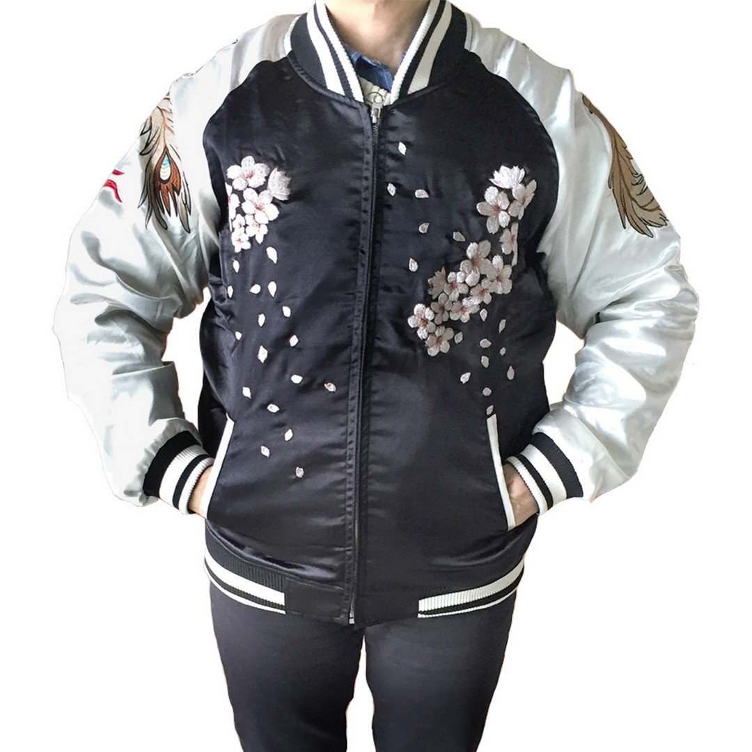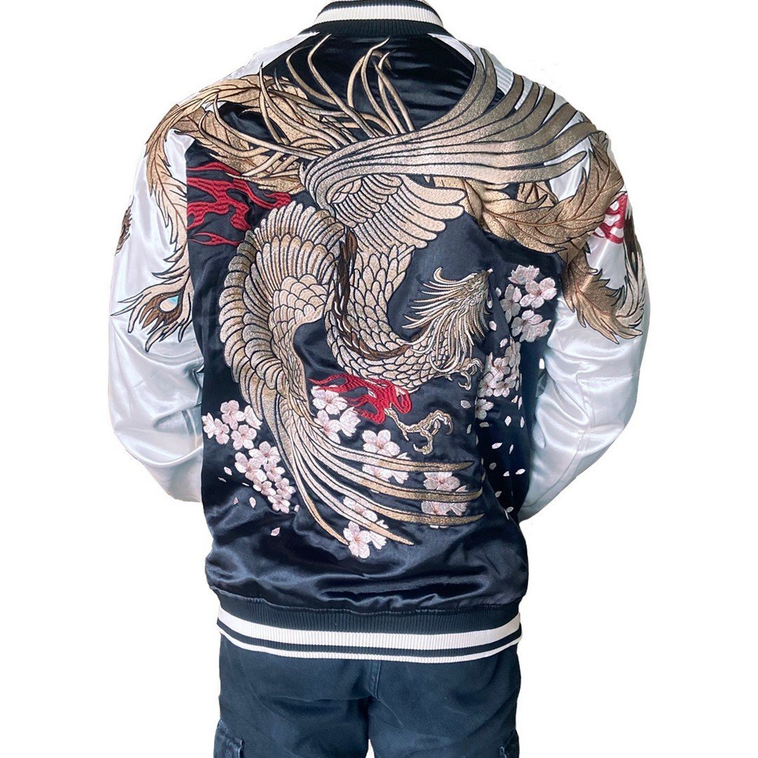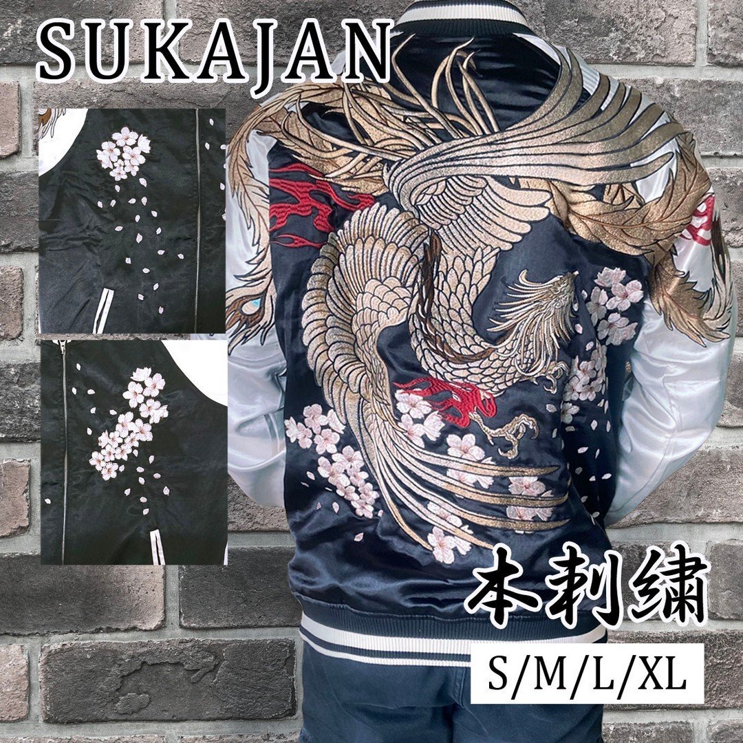 【C00250-5】スカジャン 桜 ホワイト 不死鳥 2XL 刺繍 柄 ジャンパー 上着 アウター ジャパネスク バイカーズ ジャケット フェニックス