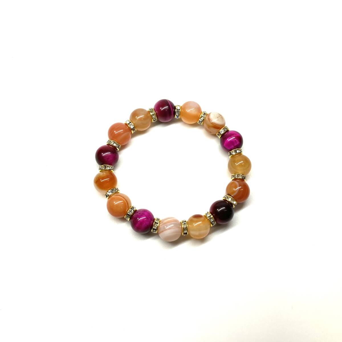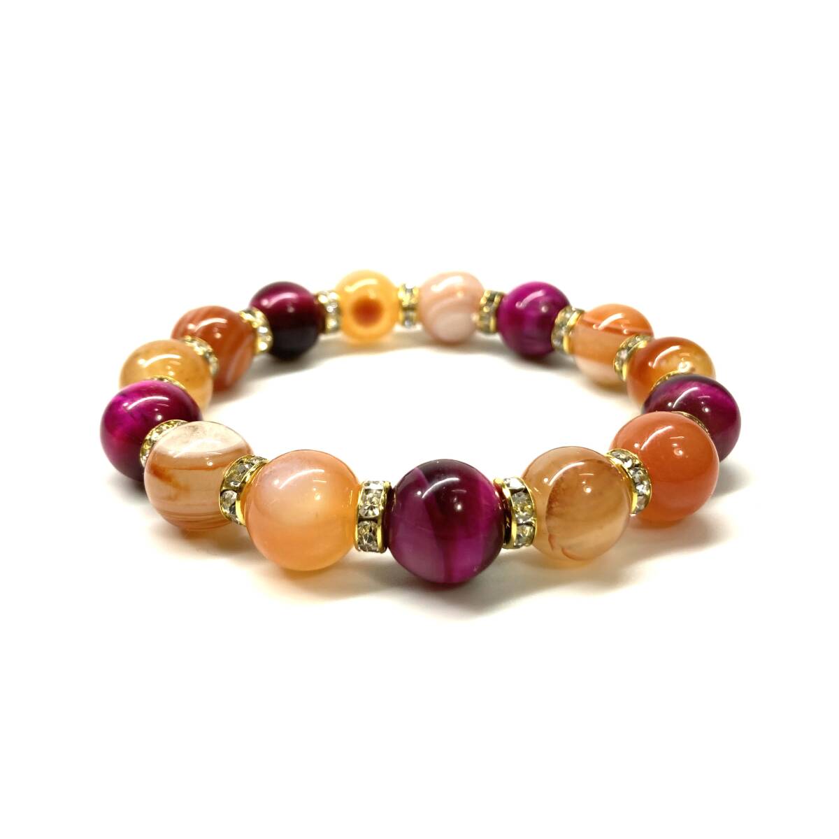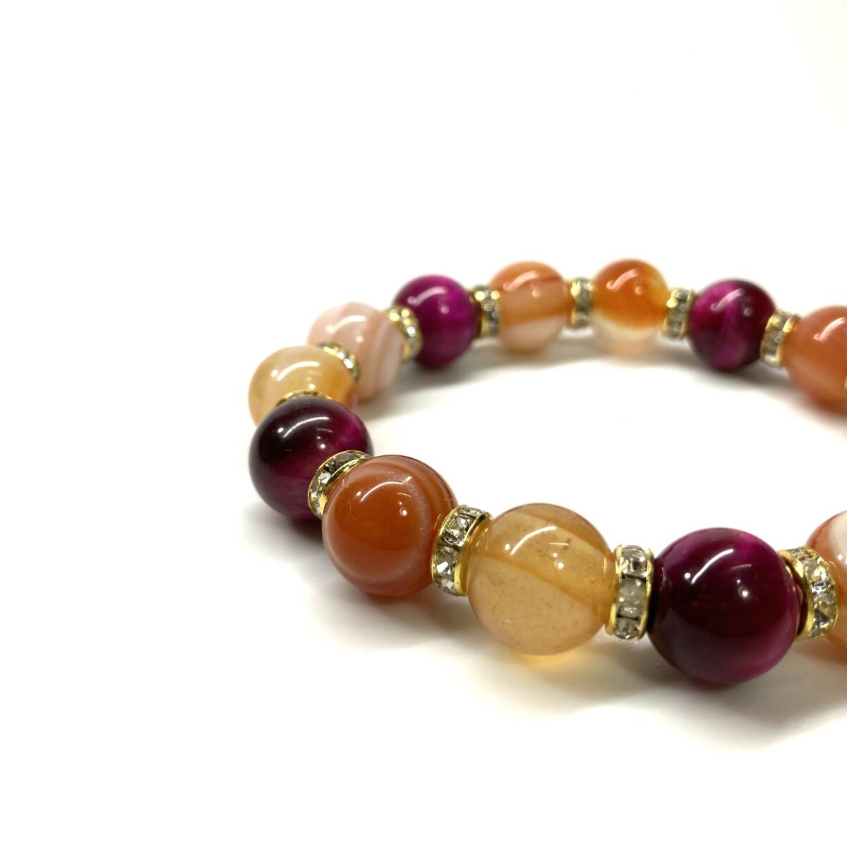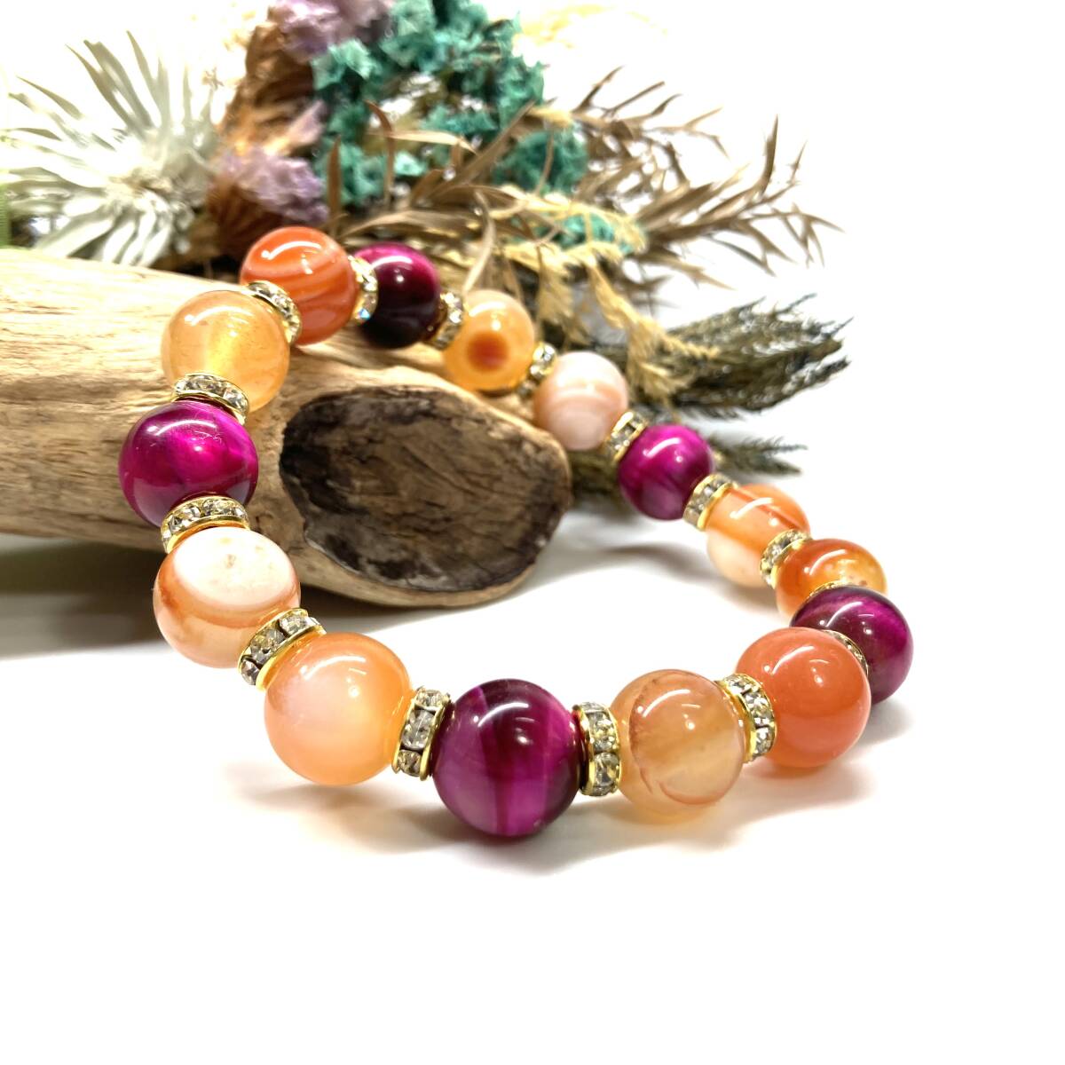 こちらは、ピンクタイガーアイとカーネリアン・サードニクス(サードオニキス)を組み合わせたパワーストーンブレスレットです。間にはロンデルを挟み高級感あるデザインに仕上げております。石大きさは12mm玉を使用して内周約18cmです。気になる方は是非この機会にどうぞ。