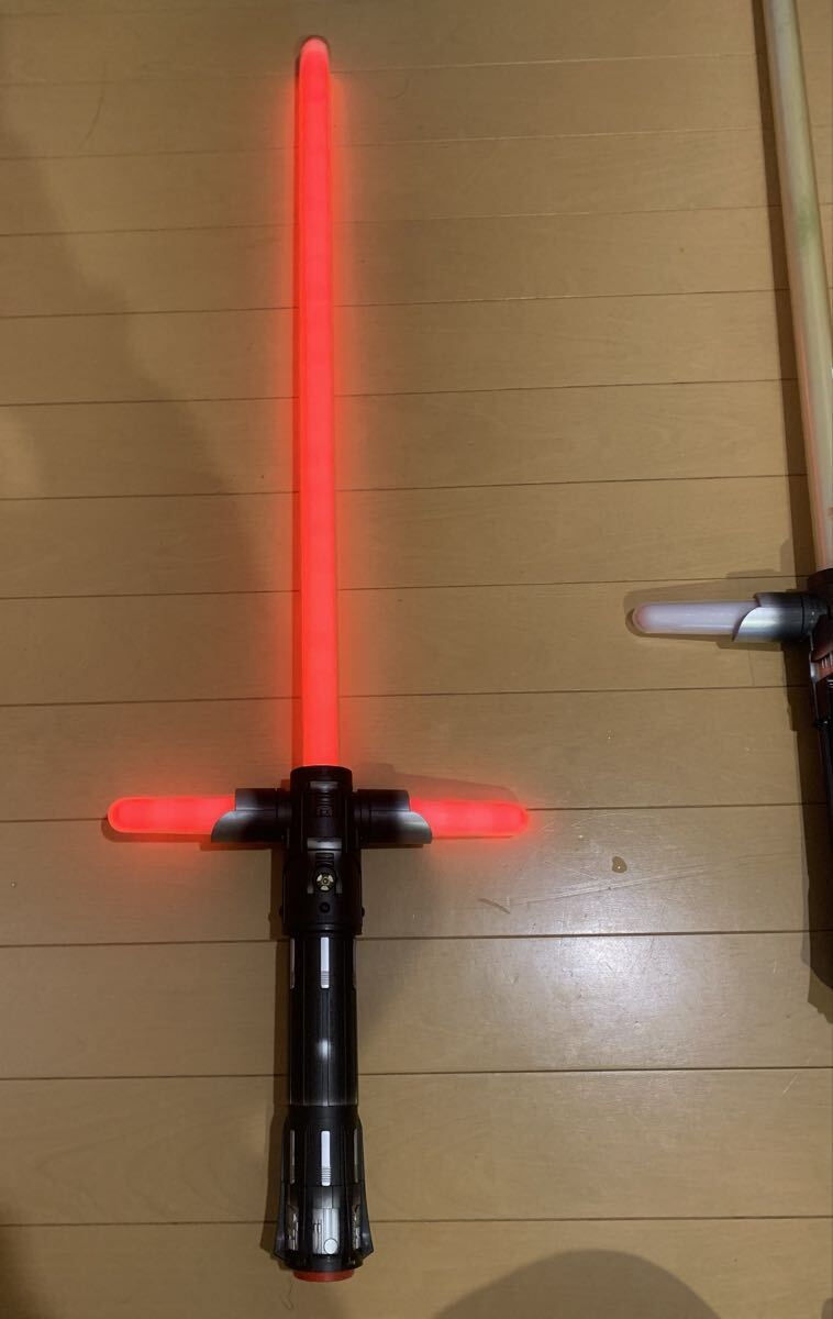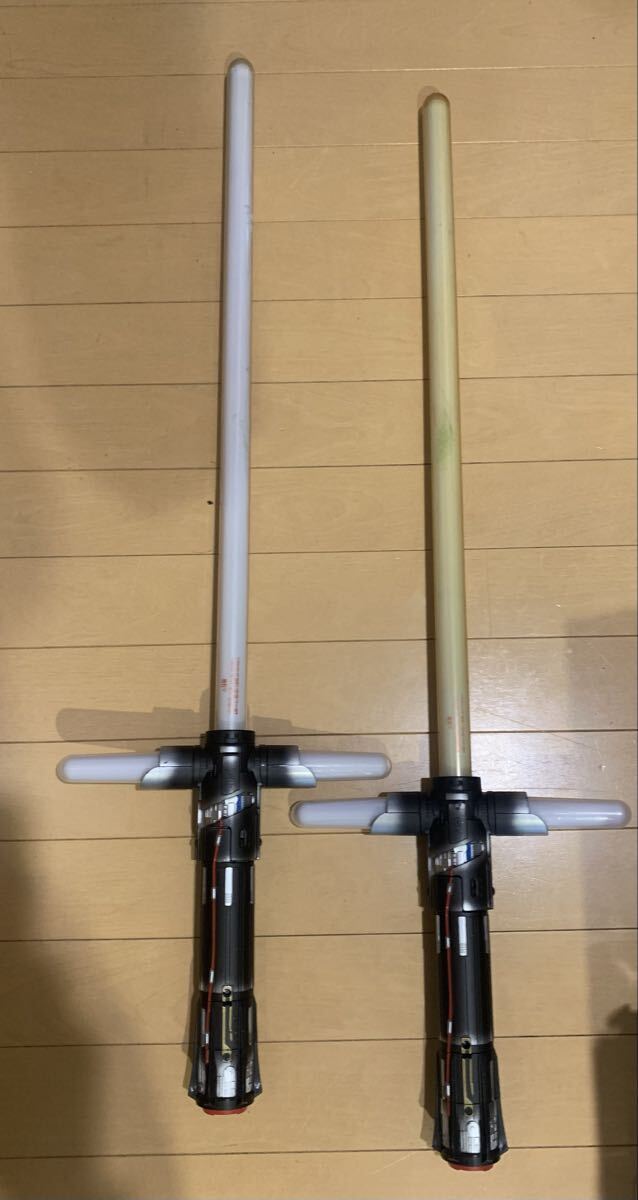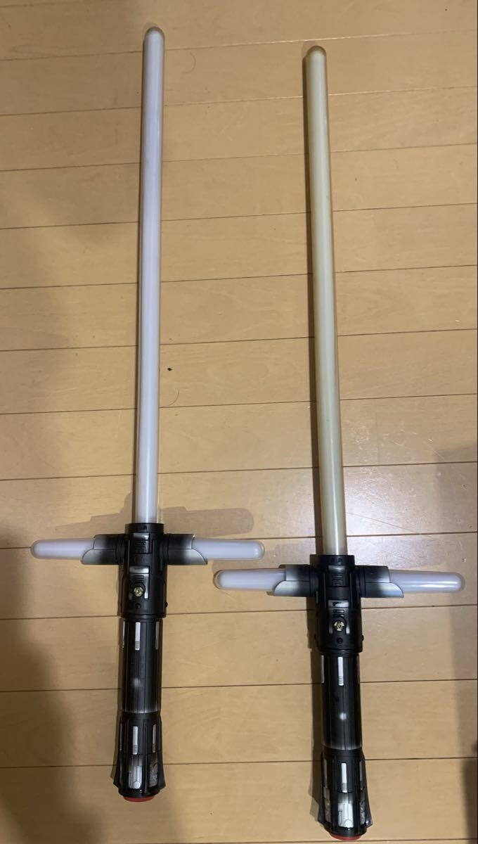 動作確認をしましたところ、両者とも音は鳴りセンサーも反応しますが、右のライトセーバーが一部光らない箇所がありますが、軽く振ると光るようになったりします。