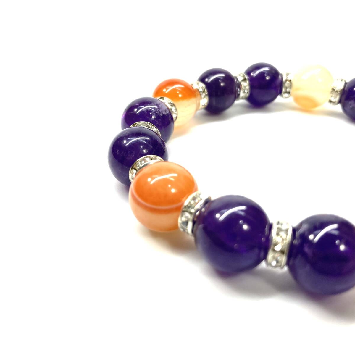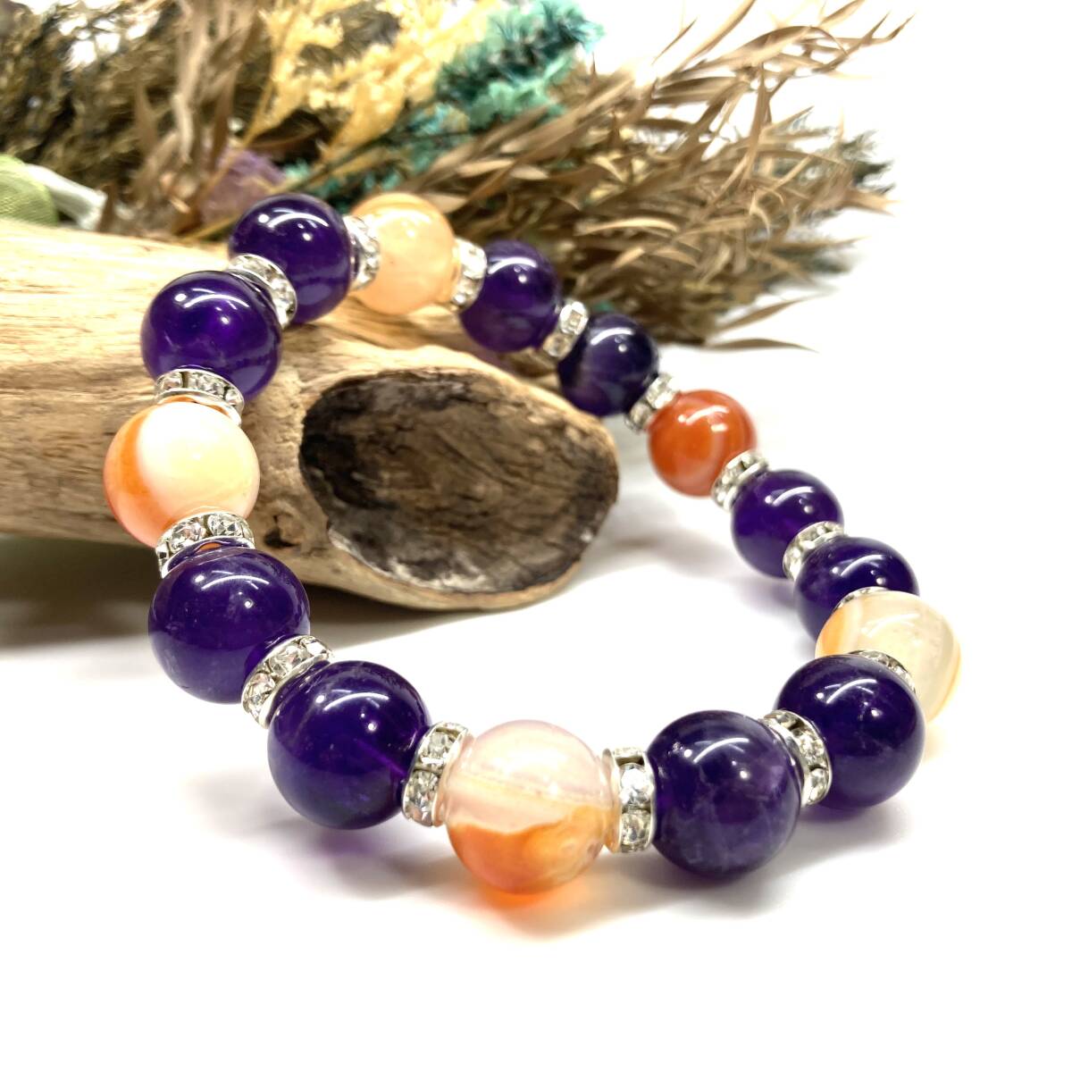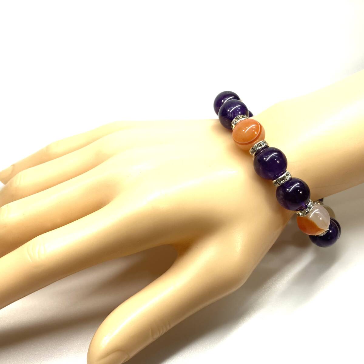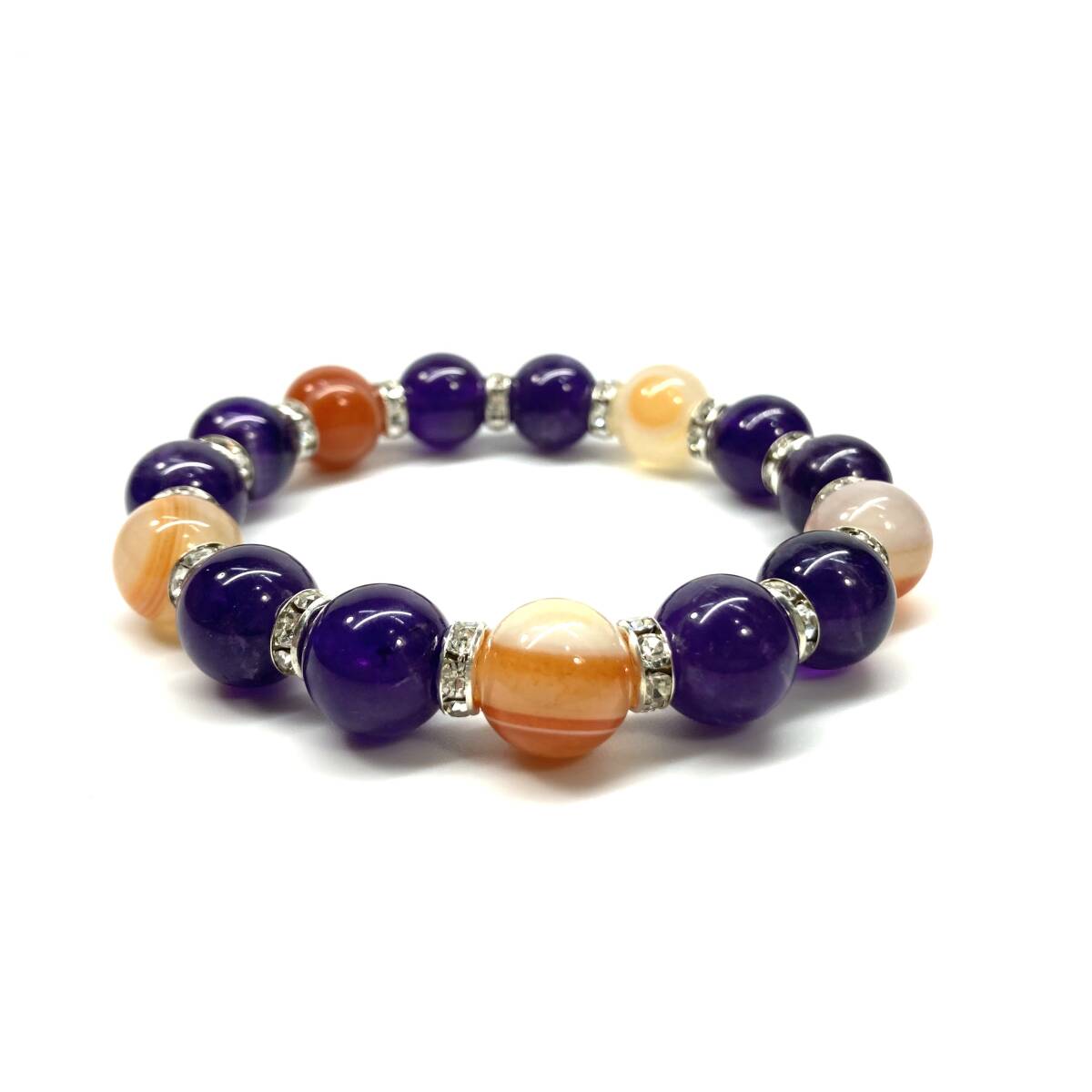 こちらは、カーネリアン・サードニクス(サードオニキス) (レッド天眼石)とアメジストを組み合わせたパワーストーンブレスレットです。間にはロンデルを挟み高級感あるデザインに仕上げております。石大きさは12mm玉を使用して内周約18cmです。気になる方は是非この機会にどうぞ。