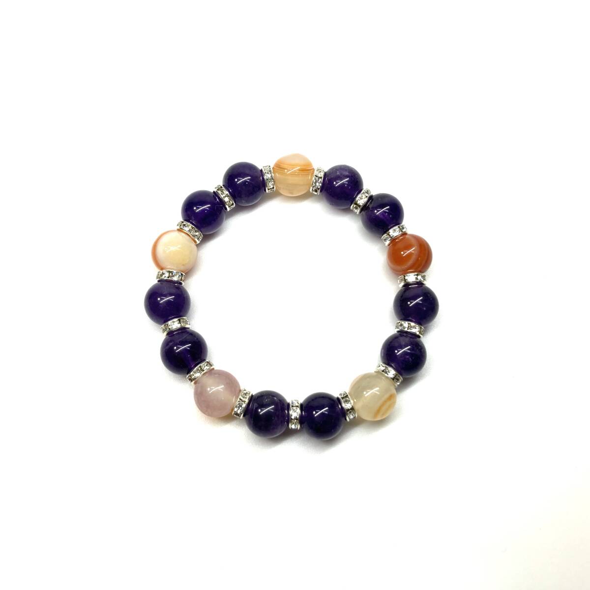 高貴な色を表す紫色をしたアメジストは霊性の高いパワーストーンと言われ、マイナスのエネルギーをプラスに変える効果があるといわれています。冷静な判断力、インスピレーション、直観力を高め、創造性を豊かにして、第六感を高めると言われ仕事、金運アップにも効果があると言われています。ストレスや過労、自律神経の乱れ、不眠のときにも有効です。「愛の守護石」として大切な人との心の絆を深め、真実の愛を守り抜く強さをはぐくむ、愛の成熟に力を与えてくれるパワーストーンです。