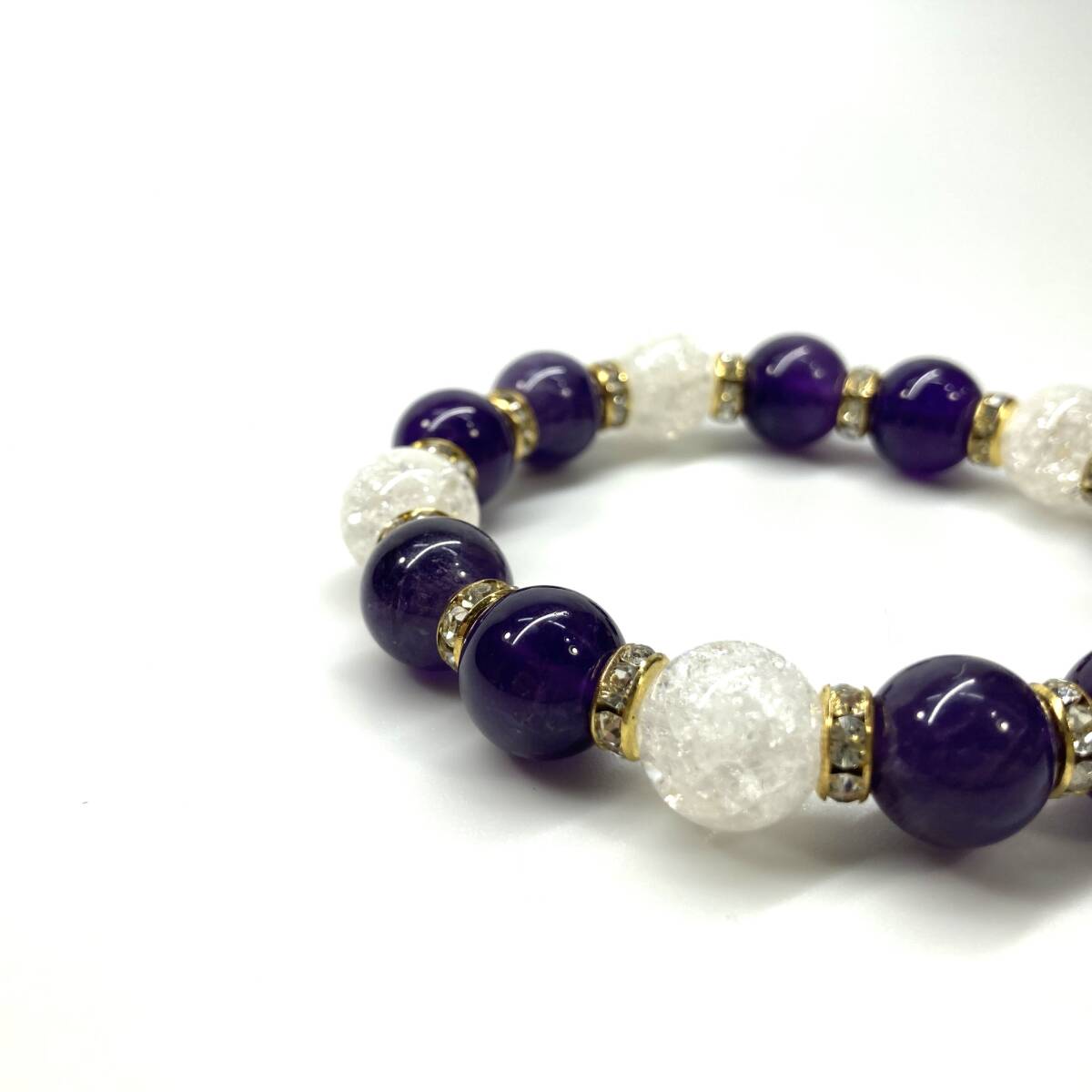こちらは、クラック水晶とアメジストを組み合わせたパワーストーンブレスレットです。間にはロンデルを挟み高級感あるデザインに仕上げております。石大きさは12mm玉を使用して内周約18cmです。気になる方は是非この機会にどうぞ。