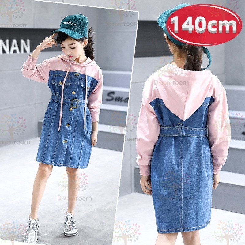 kids デニム切り替え ハイウエスト ワンピース 【140cm】ピンク 女の子 パーカー 学生 秋服 長袖 K-419pk