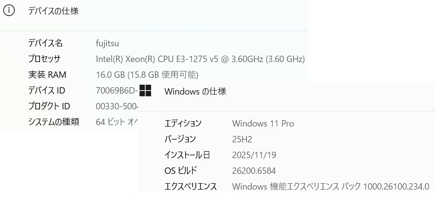 OS    Windows 11 Pro、64ビット、ver.25H2