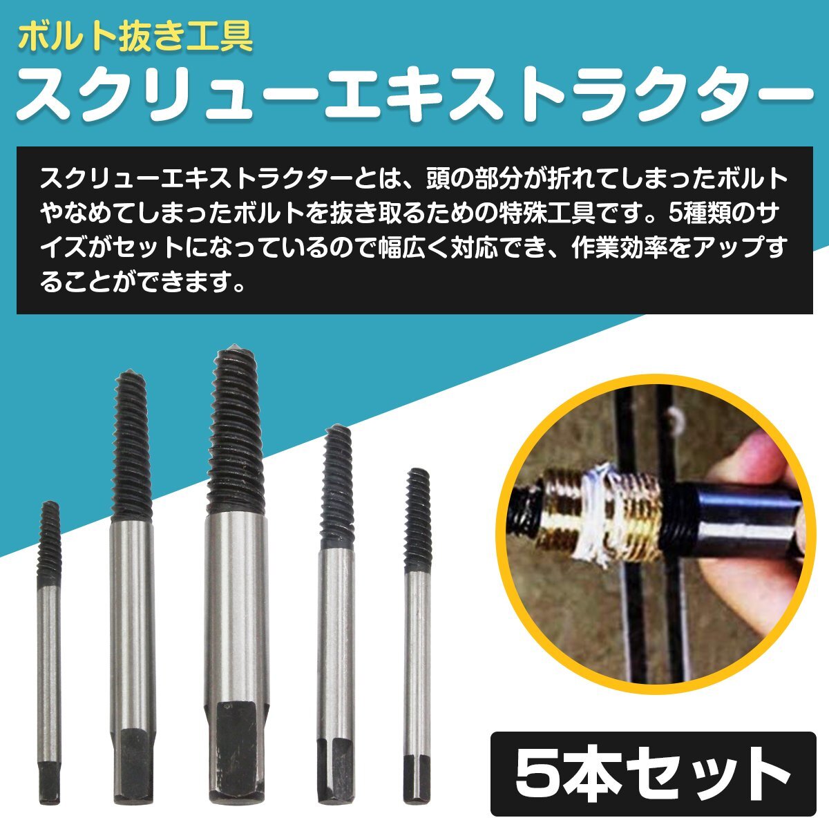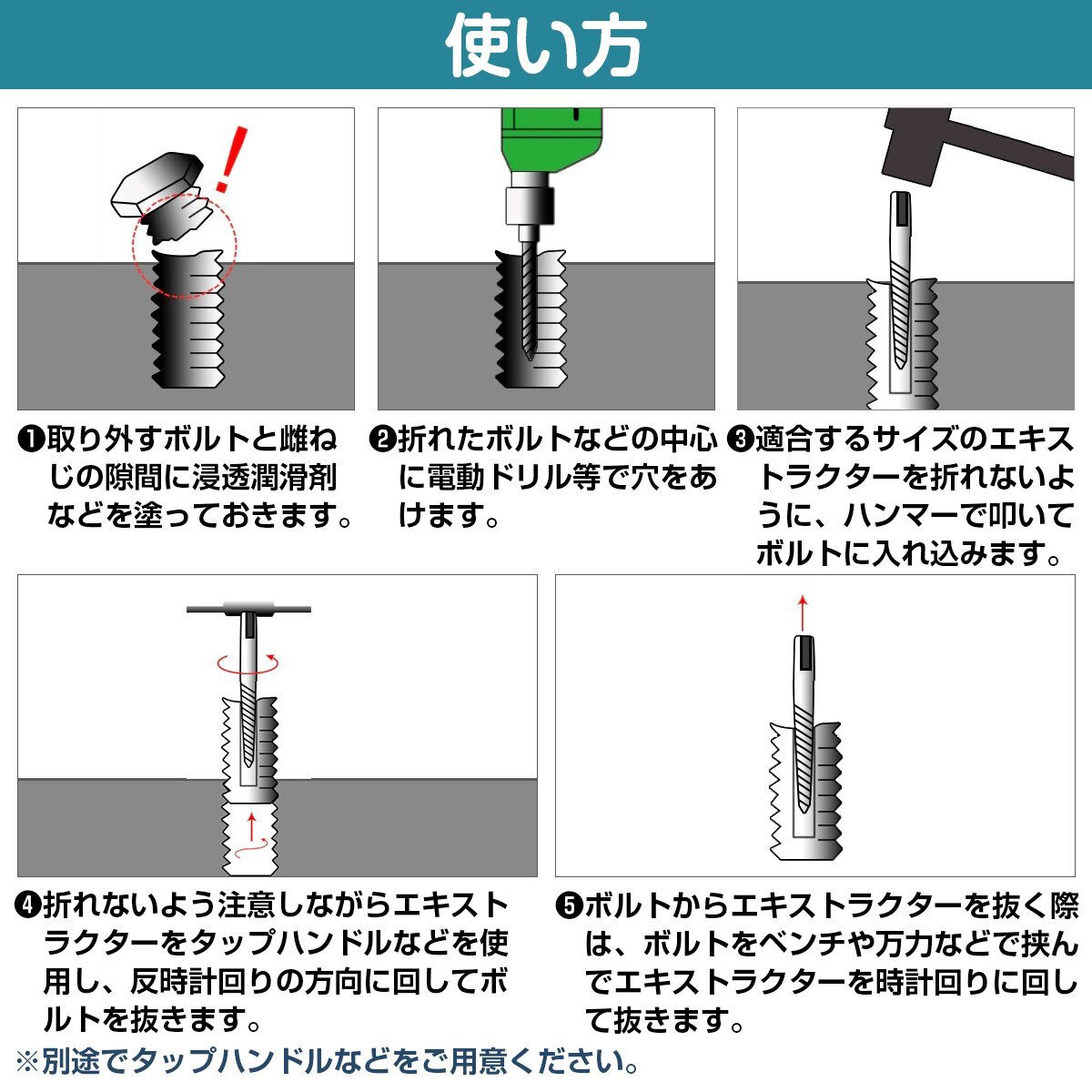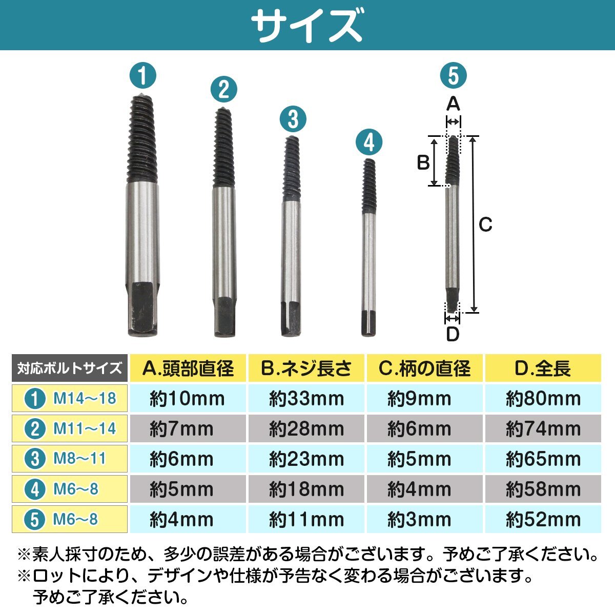 5本セット M6-8×2本/M8-11/M11-14/M14-18 スクリューエキストラクター ボルト抜き 逆タップ 外し 多様サイズ なめたネジ 折れたボルト