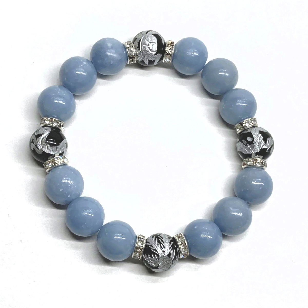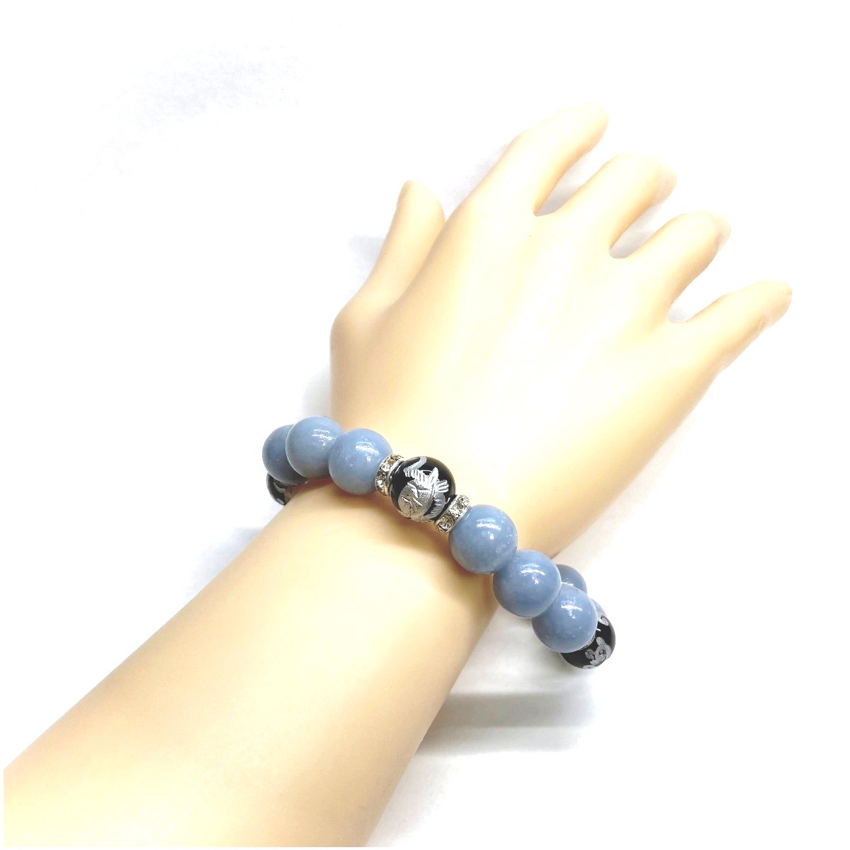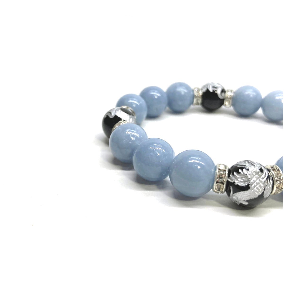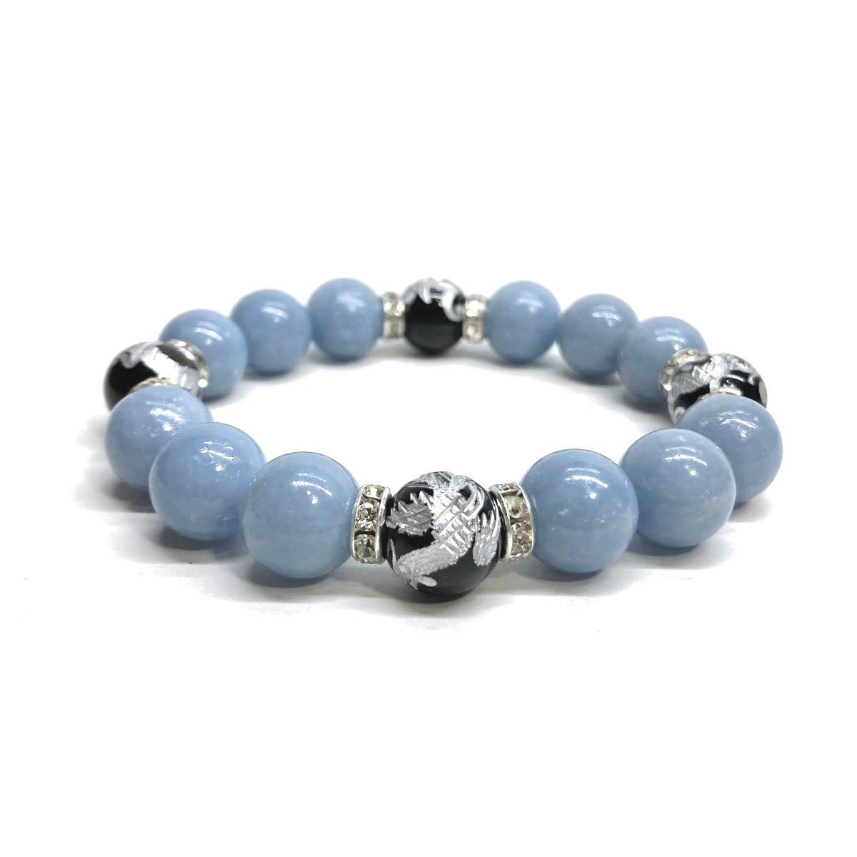 こちらは、四神獣銀彫オニキとエンジェライトを組み合わせたパワーストーンブレスレットです。四神獣は、中国の伝説で4つの方向(東西南北)を守護する神聖な神。四神獣、厄災から身を守り、多くの運気を呼び込むと言われております。石大きさは程よくインパクトのある12mm玉で内周 約17cmです。 数に限りがございますので気になる方はお早めにどうぞ。