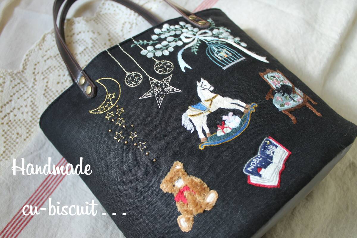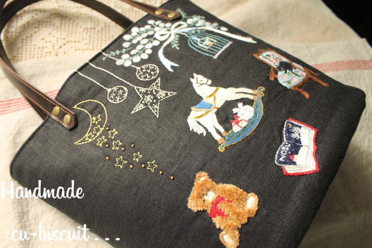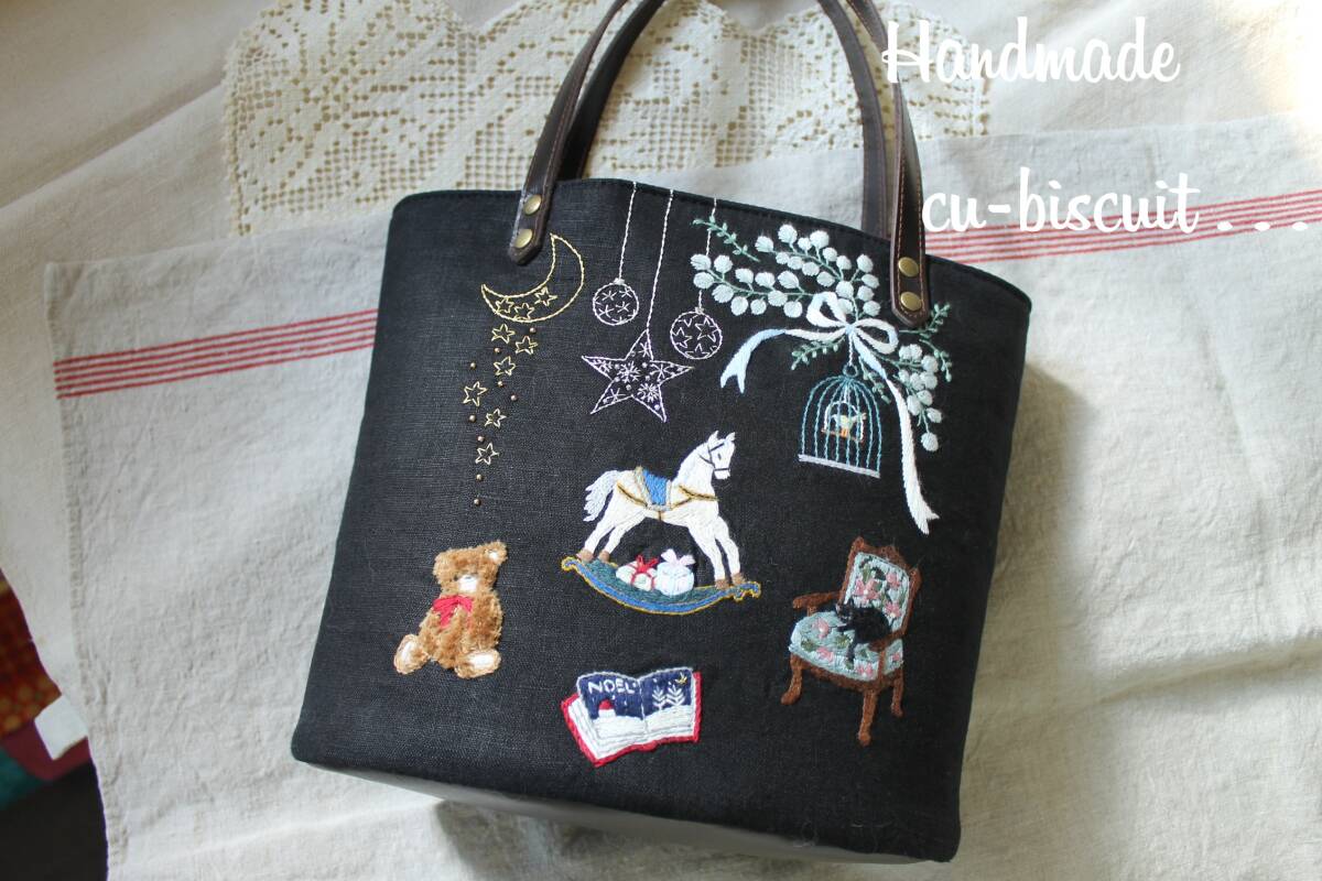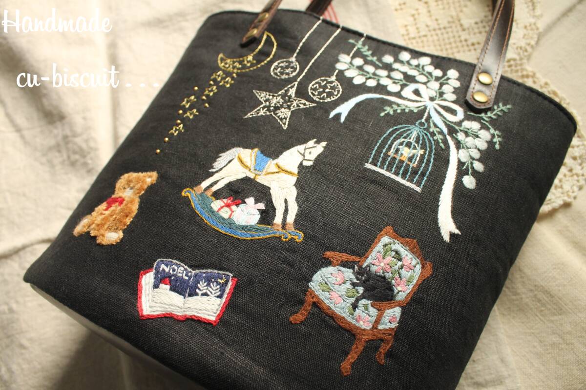 ハンドメイド+手刺繍+ティディベア+木馬+黒猫+刺繍+聖夜+トートバッグ+リネン+トート+バッグ+本革持ち手