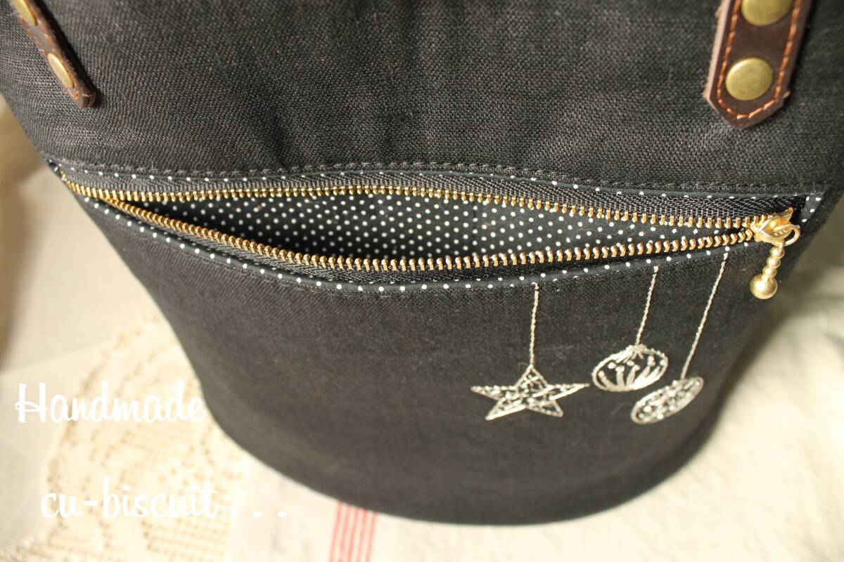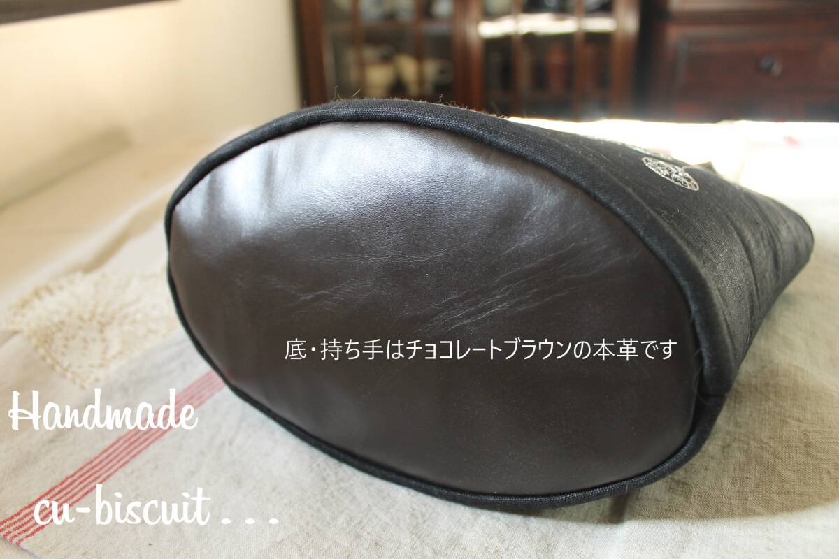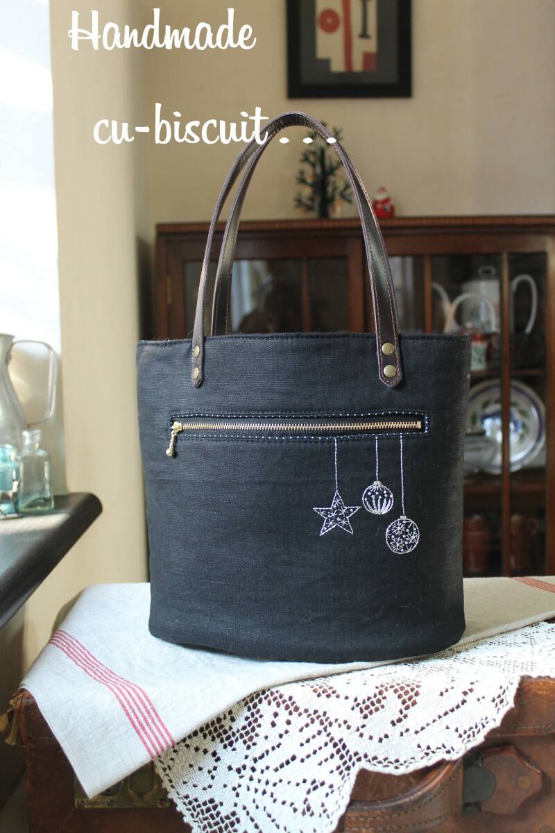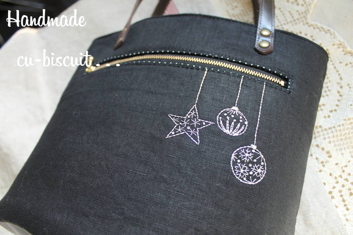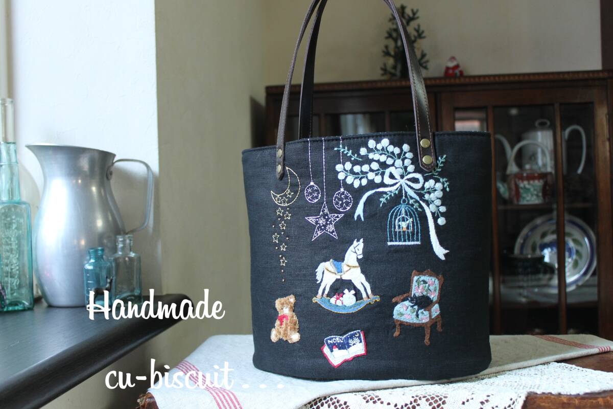 ハンドメイド+手刺繍+ティディベア+木馬+黒猫+刺繍+聖夜+トートバッグ+リネン+トート+バッグ+本革持ち手