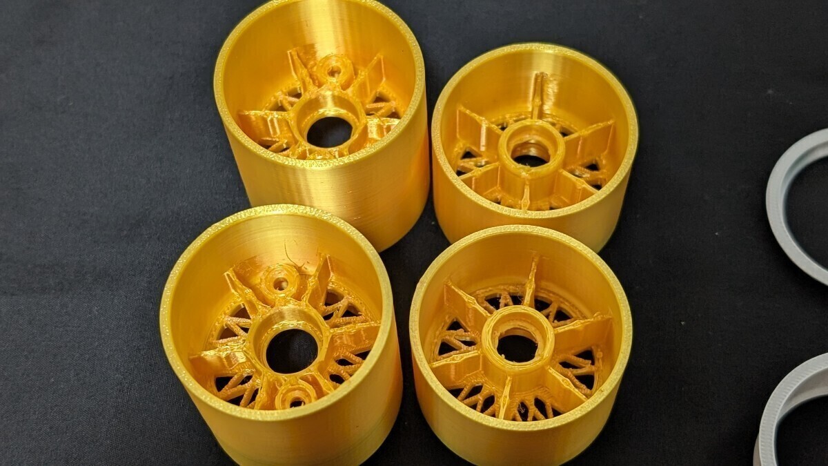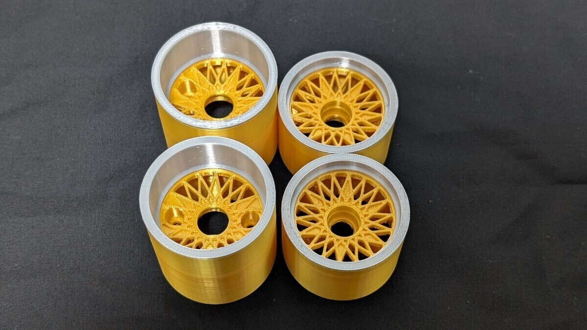 3Dプリンターで作成された、ディスプレイ用のホイールとリムの1台分セットです。