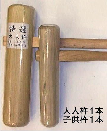 ![]() | 大人用 樫柄:長さ75cm、頭部:直径9×42cm 重量約2kg 材木・山陰地方又は南九州地方 ほうの木又はえのき 子供用 樫柄:長さ66cm、頭部:7×35cm 重量約1kg 材木・南九州 ほうの木又はえのき 入荷時によって樹種が変わりますので、樹種の 選択はできません。 天然木材には、心材(赤身)、辺材(白太)があり 色合いや木目にばらつきが生じます。 天然木ならではの味わいですので、 杵の色合い・木目のご指定はいただけません。 ※手作り品のため、杵のサイズが 多少変わる場合がございます。 |