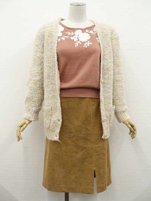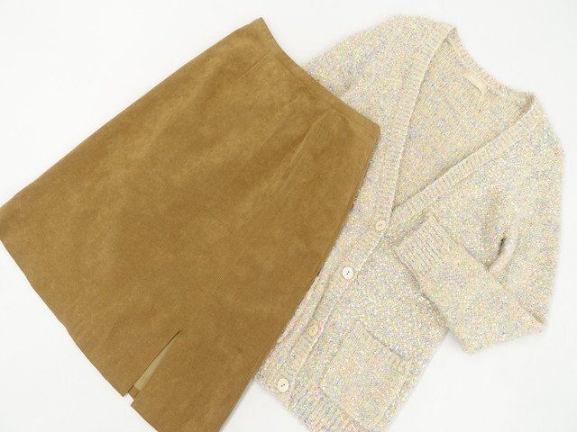 長袖カーディガン+長袖ニットセーター+ひざ丈タイトスカート コーディネート上下3点セット M相当 マルチカラー/コーラルピンク/ブラウン フェミニン系 20代