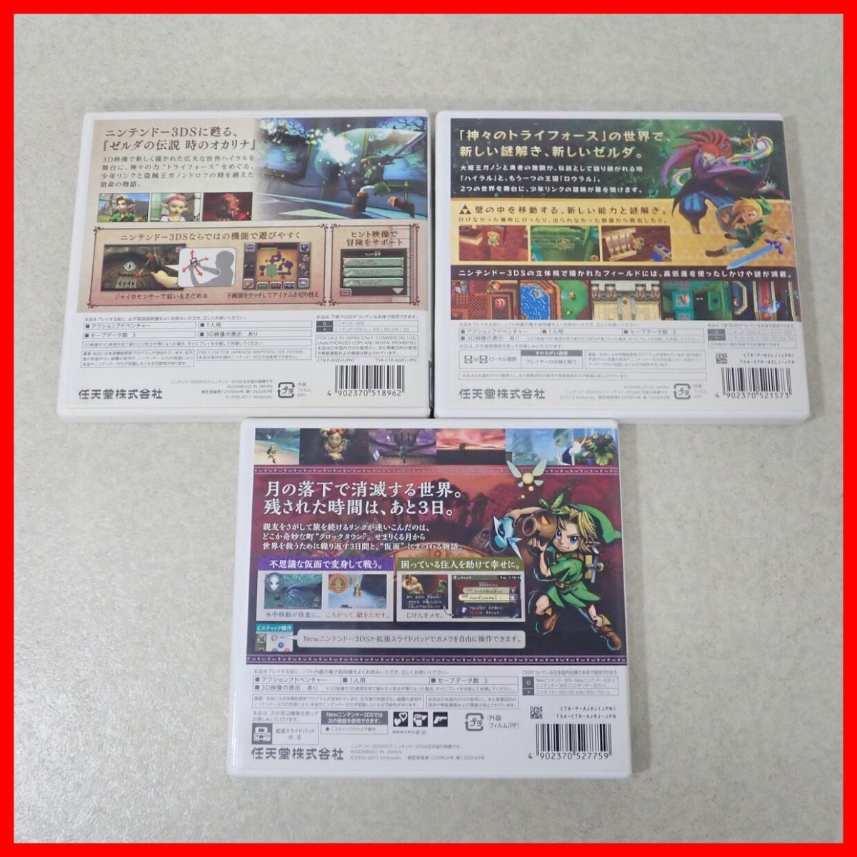 | 動作保証品 ニンテンドー3DS ゼルダの伝説 時のオカリナ3D/神々のトライフォース2/ムジュラの仮面 THE LEGEND OF ZELDA 3本セット 箱付 こちらの商品は動作保証品となりますので、一週間の動作保証をお付けします。 ■ケースにスレ、イタミ、キズ、汚れがあります。 ■取扱説明書にスレ、角スレがあります。 ■カードにスレ、キズ、汚れがあります。 ■商品の状態・セット内容につきましては写真をご確認ください。 ■一部を除いての発送は行っておりません。 ■写真のものが全てです。付属物の有無や状態については写真からご判断ください。 ■チェックに使用したモニターや機器等は、特に表記がないかぎりは付属いたしません。 ■古いものですので、当方のチェック時に動作を確認できたものでも、必ずしも商品到着後にも同じように動作することを保証するものではありません。 ■動作確認済み品で、一部のソフトだけが動かない場合など、ソフトと本体の相性による問題については当方の責任の範囲外となりますのであらかじめご了承ください。 ■中古品となりますのでソフトや本体等のメモリー、バックアップ電池等については動作を保証いたしかねます。 ■商品によりますが、発売されてから10年以上経過している中古品であることをご理解いただいた上でご入札をお願いいたします。なお、新品や美品、そのほか特記事項がある場合は別途明記します。 ■ご落札いただいた本体及び箱や取説、付属品、梱包材などは1つでも廃棄や破損をしないようにお願いいたします。 ■商品のご落札後、廃棄や破損をした場合、あるいは【修理や整備、カスタム、付属物の抜き取りやページの抜き取り/書込み等、ご落札者様の目的に応じて何らかの手が加えられた商品】に関しましては、問題があった場合でも対応や返金などの対処ができませんのでご注意ください。 |