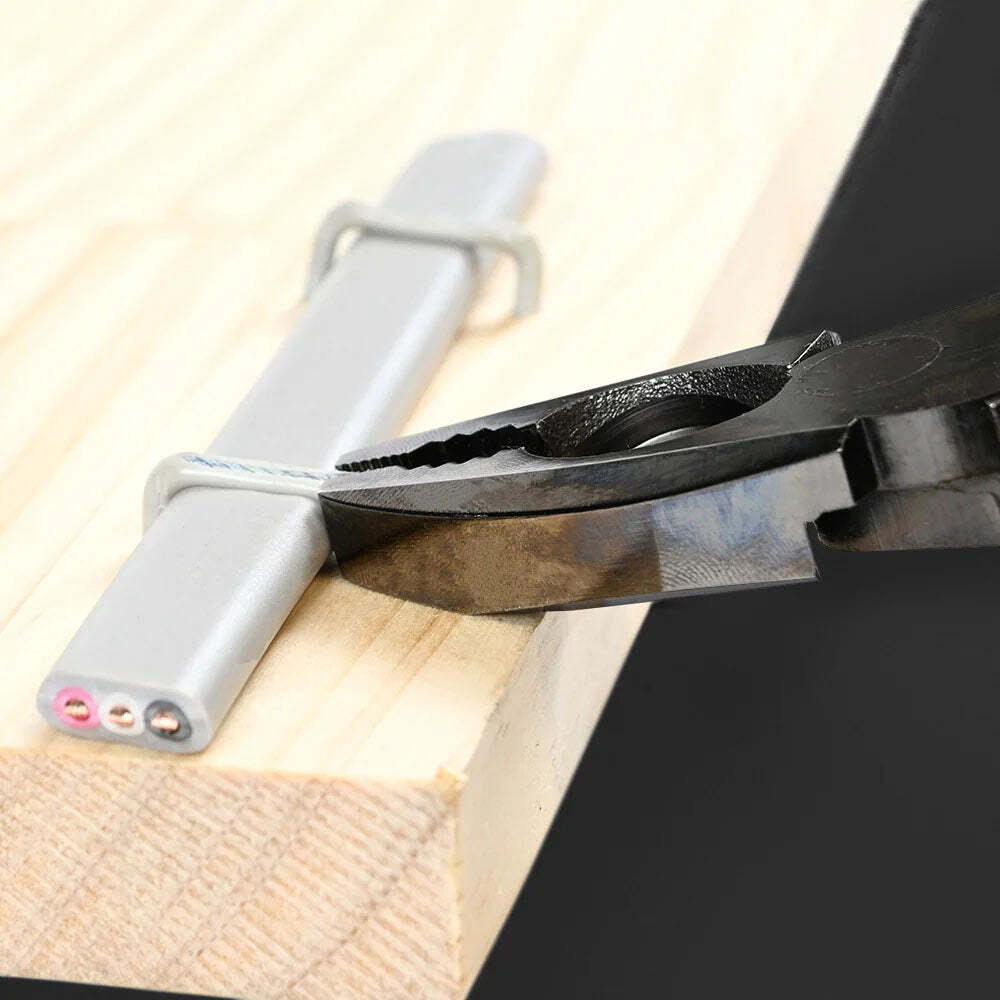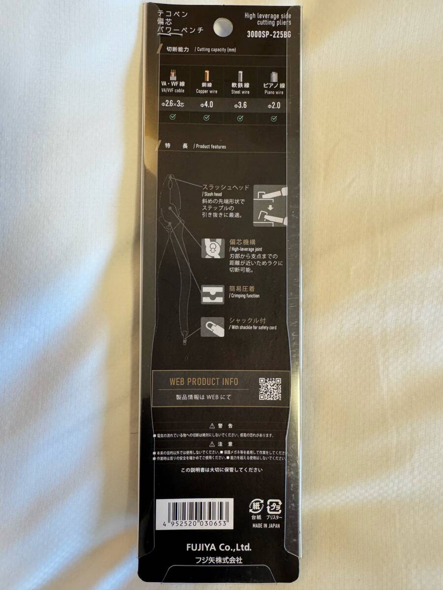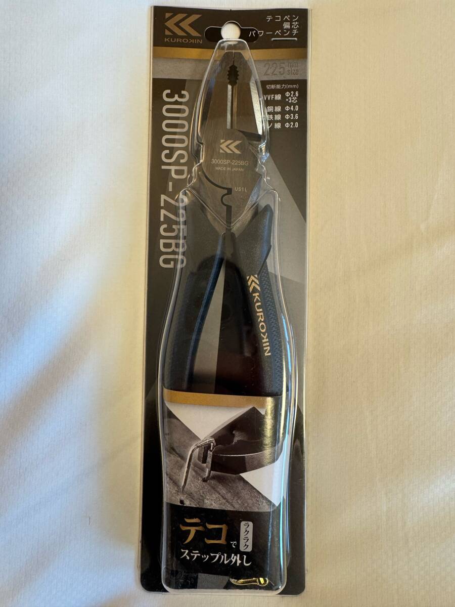 フジ矢・KUROKIN/3000SP-225BG/テコペン偏芯パワーペンチ 225mm 斜めにカットされた先端形状により、ステップルの引き抜きに最適 【用途】 ステップルの引き抜きや線材の切断 【特徴】 ・刃部から支点迄の距離が近い偏芯機構により、ラクに切断が可能 ・簡易圧着機能付き ・落下防止用のシャックル付き 全長:234mm 重量:360g 切断能力:(鉄線)3.6mm径、(銅線)4.0mm径、(ピアノ線)2.0mm径、(VVF・VA線)2.6mm径×3芯 本体:特殊鋼、グリップ部:塩化ビニール ◆ノークレーム、ノーリターンでお願い致します。 ◆神経質な方の入札はご遠慮下さい ※パッケージに小傷や割れがあります ◆落札後24時間以内の取引開始、2日以内にご入金出来る方のみの入札をお願いします。
