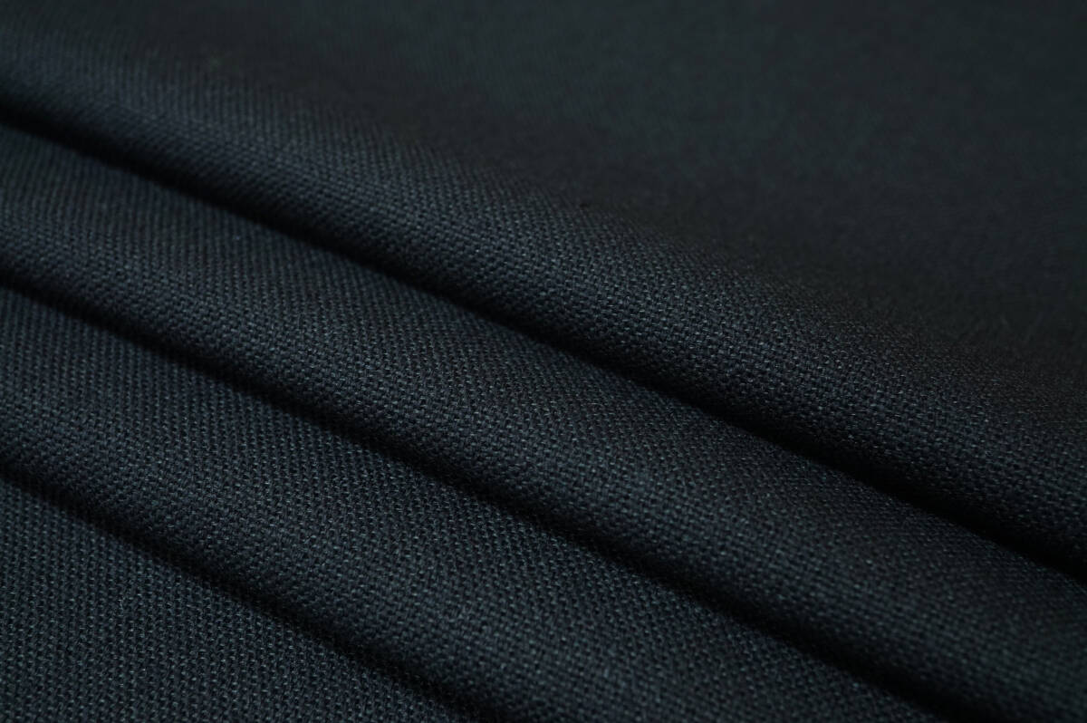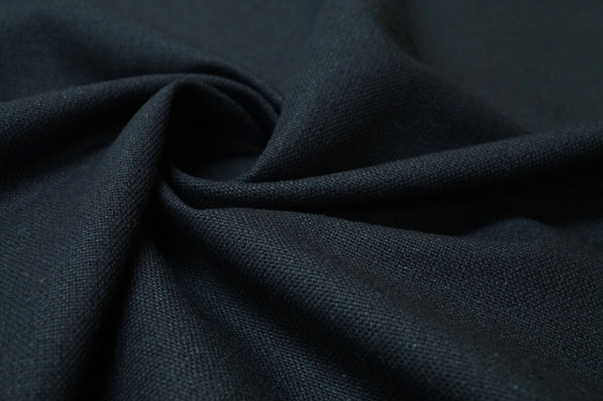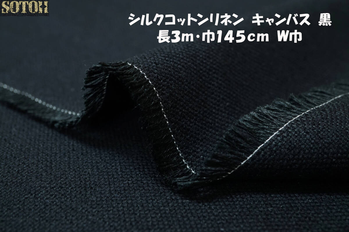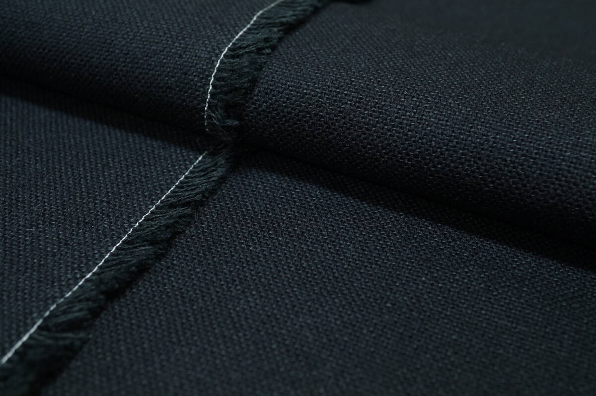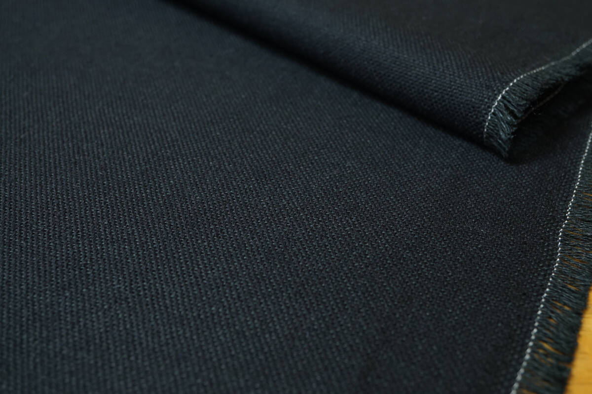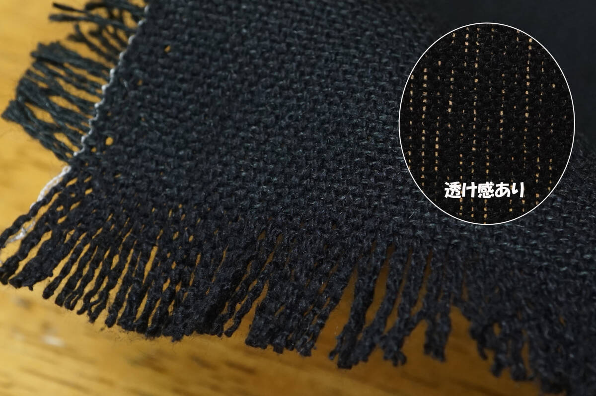尾州産で、シルク(経糸)・コットンリネン(緯糸)、中厚地程度ですが高密度な織地ではなく弱めの透け感があり、シルクやリネン独特のコシを感じる手触りで、色調はブラックでございます。