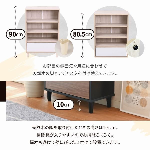 | 【カラー】 ホワイト、ブラウン、ナチュラル、ブラック×ブラウン、ナチュラル×ホワイト 【サイズ】 <外寸> 幅60×奥行29.5×高さ90(アジャスター80.5)cm <内寸> オープン部:幅56×奥行25.5×高さ57.5cm 可動棚:幅56×奥行25.5×厚み1.5cm(3.2cmピッチ9穴) 引き出し:幅51×奥行23.5×高さ9.5(有効11)cm 【材質】 <ホワイト> 本体:プリント紙化粧合板 天板:合成樹脂化粧合板(PVC) 引き出し前板:合成樹脂化粧繊維板(PVC) 脚:天然木 <ブラウン、ナチュラル> 本体:プリント紙化粧合板 引き出し前板:プリント紙化粧繊維板 脚:天然木 <ブラック×ブラウン> 本体:プリント紙化粧合板 天板:合成樹脂化粧合板(PVC) 引き出し前板:プリント紙化粧繊維板 脚:天然木 <ナチュラル×ホワイト> 本体:プリント紙化粧合板 引き出し前板:合成樹脂化粧繊維板(PVC) 脚:天然木 【耐荷重】 天板:(約)10kg以下 可動棚:各(約)5kg以下 固定棚:(約)5kg以下 引き出し:(約)5kg以下 【生産国】 中国 【梱包】 サイズ:82.3×33×16.5cm、重量:15.5kg 【その他】 ・可動棚2枚 ・背面化粧なし ・脚裏フェルト付き ・アジャスター付き 【組み立て品】 お客様による組み立てが必要です。 【ご注意】 ・サイズ、重量は概算です。 ・商品カラーはご使用のモニターによって実際の明るさや色と異なって見える場合がございます。 |